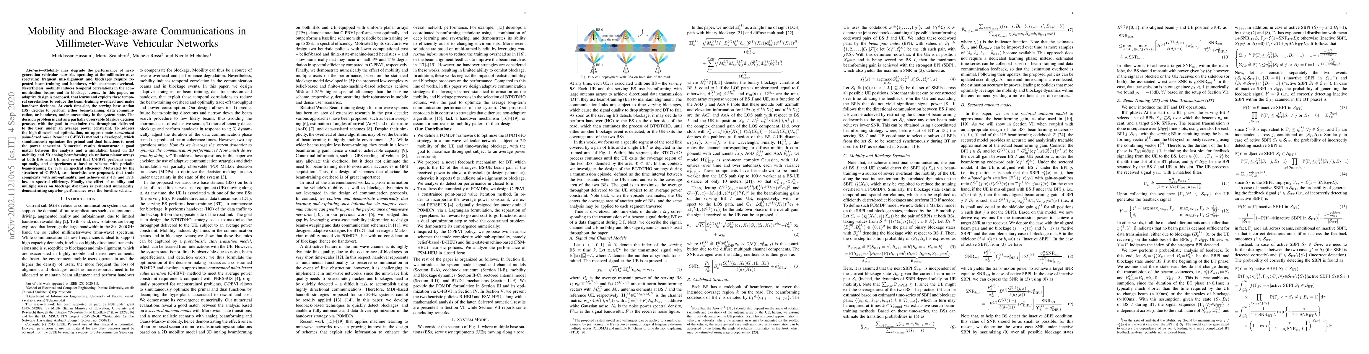 This paper proposes an adaptive design for beam training, data transmission, and handover in millimeter-wave vehicular networks to exploit temporal correlations and reduce overhead. An approximate constrained point-based value iteration method is developed to optimize throughput under power constraints, outperforming a baseline scheme by 38% in spectral efficiency.