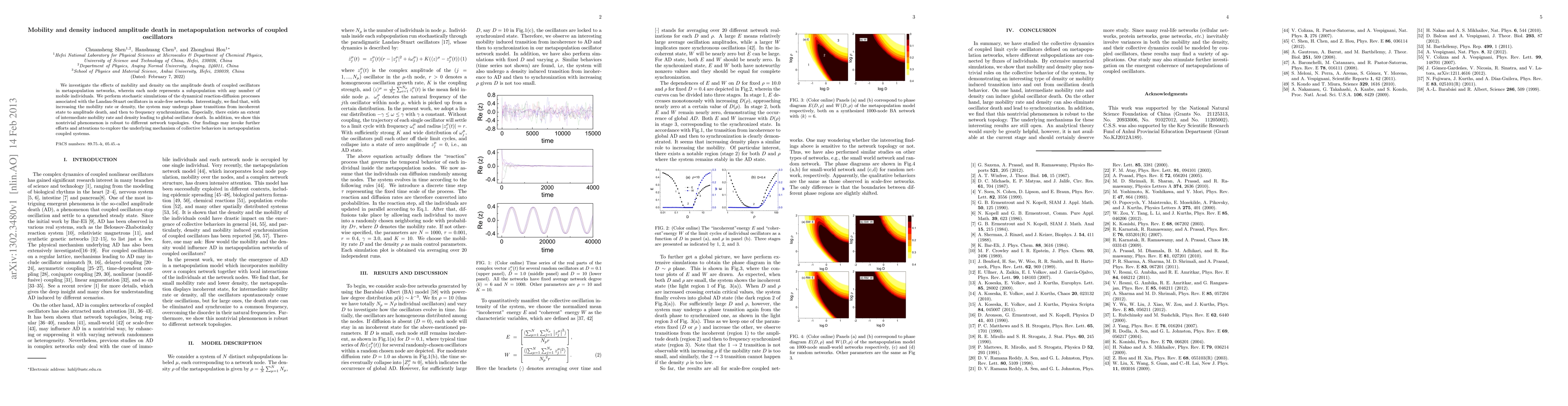 This paper explores how mobility and density affect amplitude death in metapopulation networks of coupled oscillators, finding that increased mobility or density can lead to transitions from incoherent state to amplitude death and eventually to frequency synchronization. The study reveals an intermediate range of mobility and density that induces global oscillator death, a phenomenon robust across various network topologies.