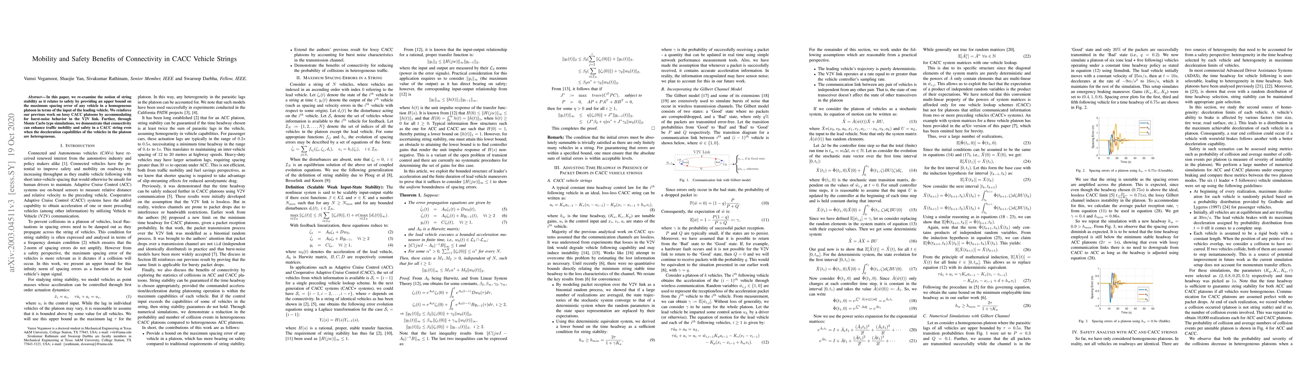 In this paper, we re-examine the notion of string stability as it relates to safety by providing an upper bound on the maximum spacing error of any vehicle in a homogeneous platoon in terms of the input of the leading vehicle. We reinforce our previous work on lossy CACC platoons by accommodating for burst-noise behavior in the V2V link. Further, through Monte Carlo type simulations, we demonstrate that connectivity can enhance traffic mobility and safety in a CACC string even when the deceleration capabilities of the vehicles in the platoon are heterogeneous.