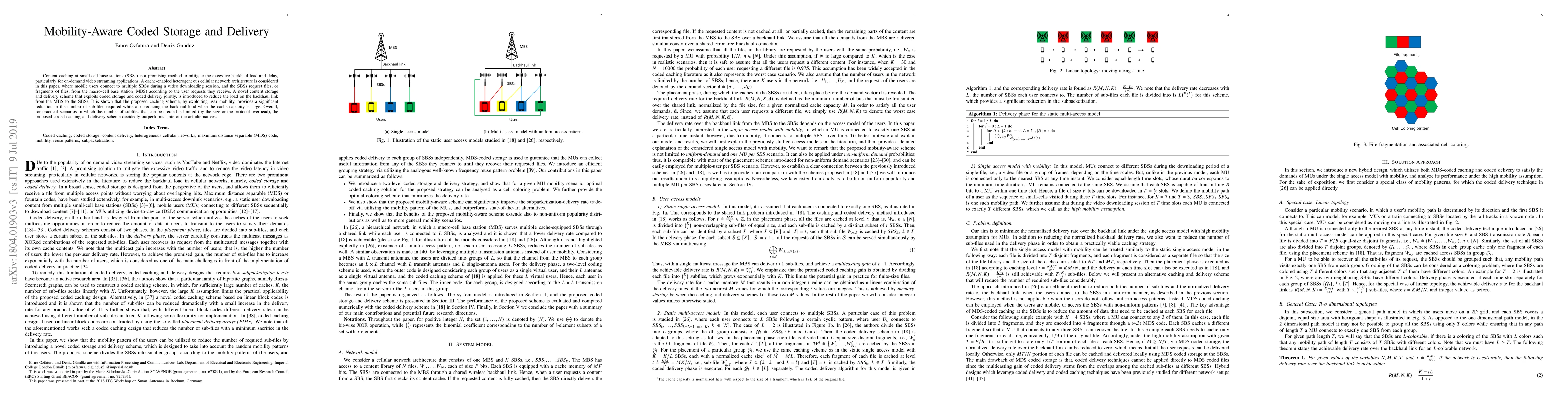 Content caching at small-cell base stations (SBSs) is a promising method to mitigate the excessive backhaul load and delay, particularly for on-demand video streaming applications. A cache-enabled heterogeneous cellular network architecture is considered in this paper, where mobile users connect to multiple SBSs during a video downloading session, and the SBSs request files, or fragments of files, from the macro-cell base station (MBS) according to the user requests they receive. A novel coded storage and delivery scheme is introduced to reduce the load on the backhaul link from the MBS to the SBSs. The achievable backhaul delivery rate as well as the number of sub-files required to achieve this rate are studied for the proposed coded delivery scheme, and it is shown that the proposed scheme provides significant reduction in the number of sub-files required, making it more viable for practical applications.