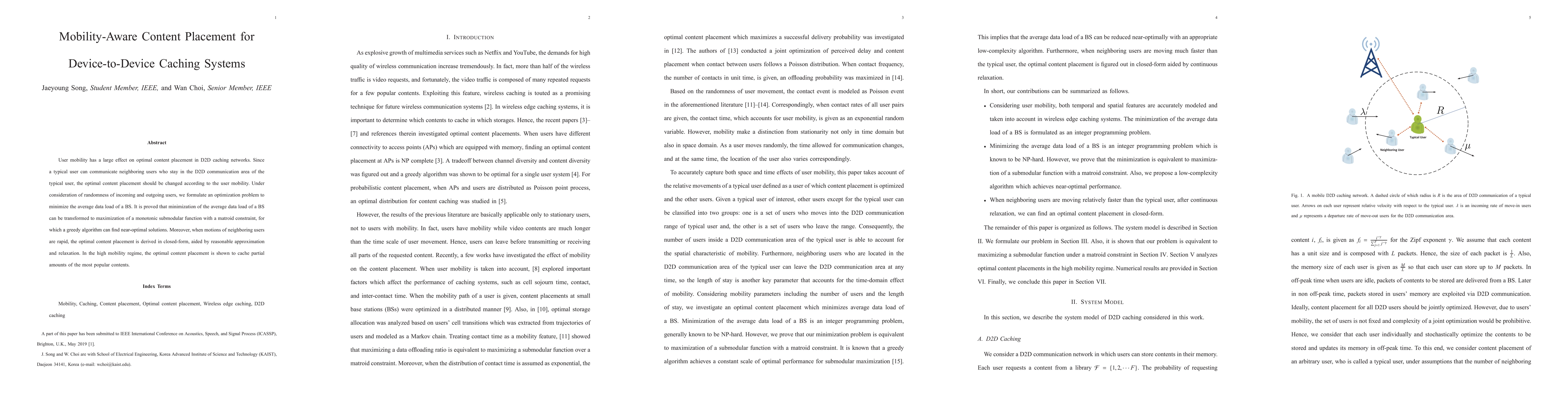 This paper proposes a method to optimize content placement in device-to-device caching systems based on user mobility, aiming to minimize the average data load of a base station. The approach uses a greedy algorithm and can find near-optimal solutions even in high mobility regimes.