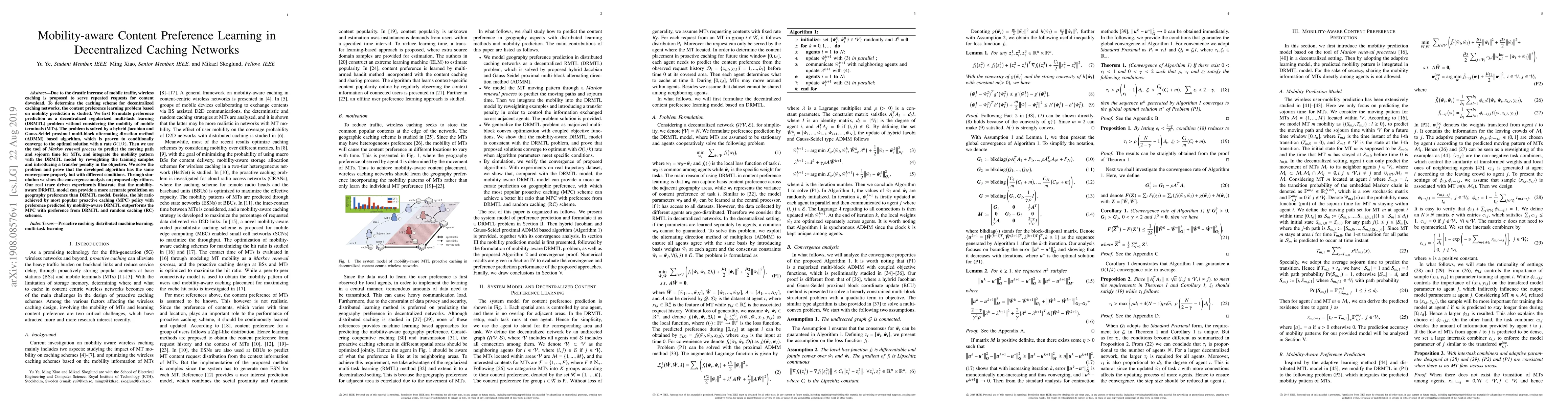 Due to the drastic increase of mobile traffic, wireless caching is proposed to serve repeated requests for content download. To determine the caching scheme for decentralized caching networks, the content preference learning problem based on mobility prediction is studied. We first formulate preference prediction as a decentralized regularized multi-task learning (DRMTL) problem without considering the mobility of mobile terminals (MTs). The problem is solved by a hybrid Jacobian and Gauss-Seidel proximal multi-block alternating direction method (ADMM) based algorithm, which is proven to conditionally converge to the optimal solution with a rate $O(1/k)$. Then we use the tool of \textit{Markov renewal process} to predict the moving path and sojourn time for MTs, and integrate the mobility pattern with the DRMTL model by reweighting the training samples and introducing a transfer penalty in the objective. We solve the problem and prove that the developed algorithm has the same convergence property but with different conditions. Through simulation we show the convergence analysis on proposed algorithms. Our real trace driven experiments illustrate that the mobility-aware DRMTL model can provide a more accurate prediction on geography preference than DRMTL model. Besides, the hit ratio achieved by most popular proactive caching (MPC) policy with preference predicted by mobility-aware DRMTL outperforms the MPC with preference from DRMTL and random caching (RC) schemes.