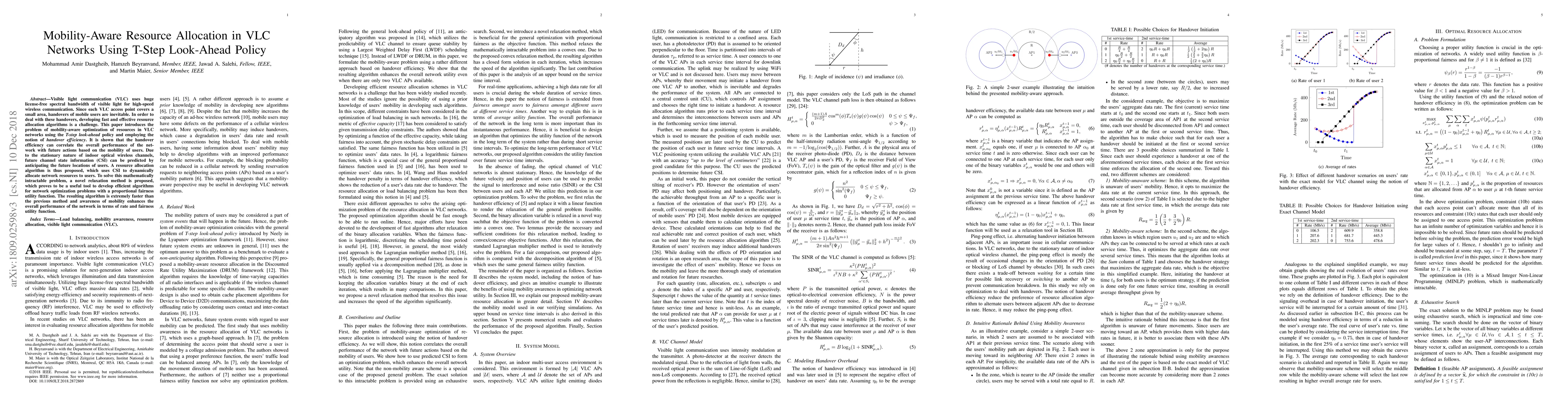 This paper proposes a mobility-aware resource allocation algorithm for visible light communication (VLC) networks using a T-step look-ahead policy to optimize handover efficiency. The algorithm leverages predicted future channel state information to dynamically allocate resources, significantly improving network performance and fairness.