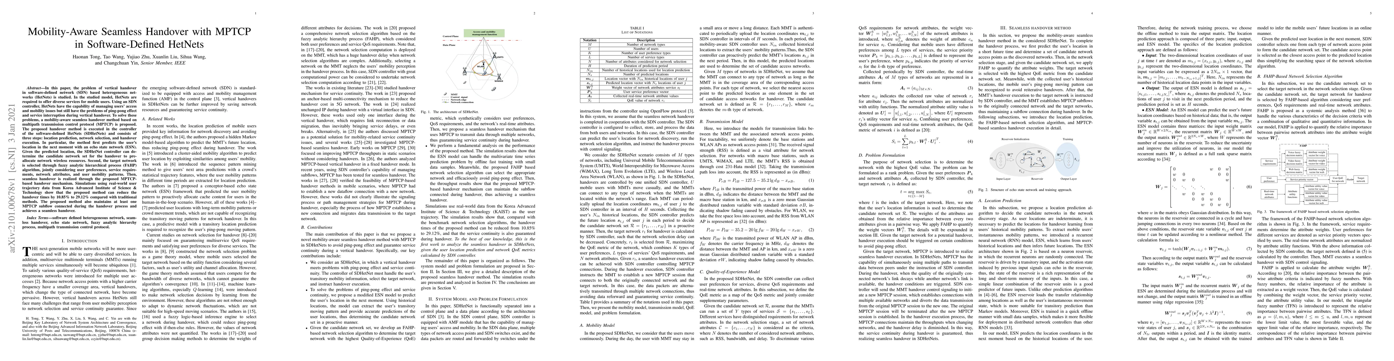 This paper proposes a mobility-aware seamless handover method using MPTCP in software-defined HetNets to mitigate ping-pong effects and service interruptions during vertical handovers. The method involves location prediction, network selection via FAHP, and MPTCP-based handover execution, achieving a 10.85% to 29.12% reduction in handover times compared to traditional methods.