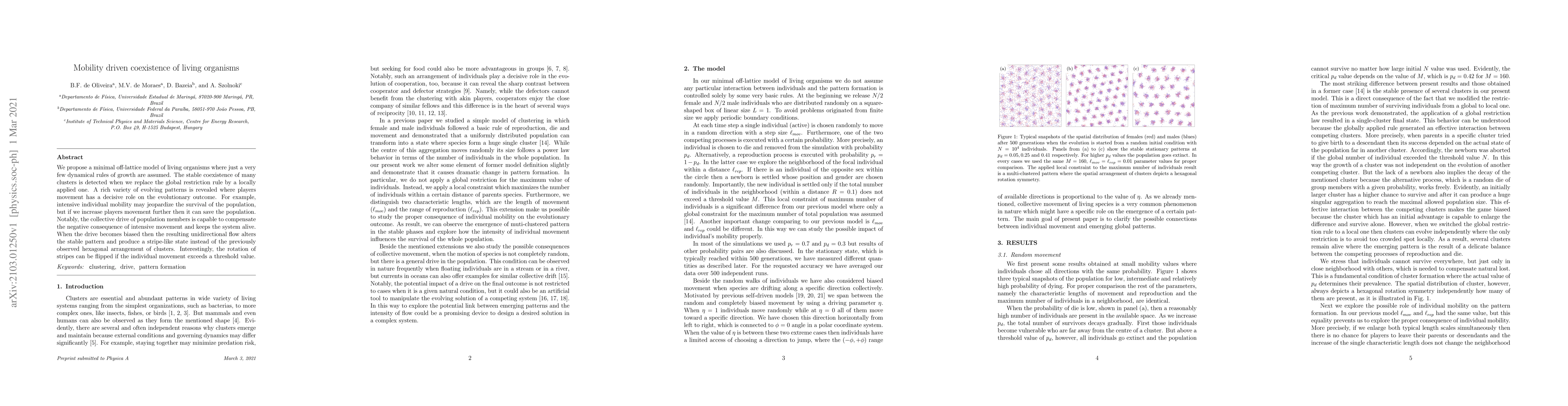 This paper presents a minimal off-lattice model to study the coexistence of living organisms, showing that local rules can lead to stable cluster formation. It reveals that while individual mobility can threaten population survival, increased movement can also rescue it, with collective drive compensating for negative effects and altering patterns when biased.
