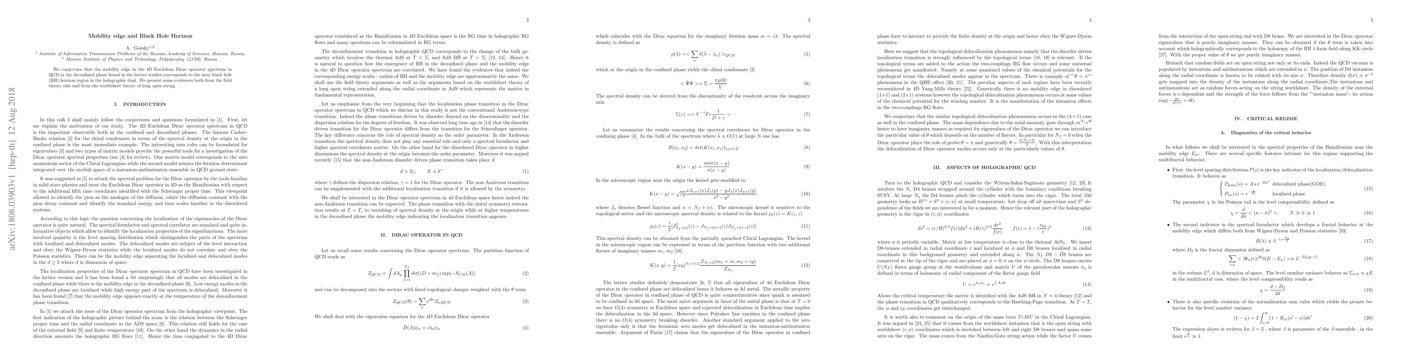 We conjecture that the mobility edge in the 4D Euclidean Dirac operator spectrum in QCD in the deconfined phase found in the lattice studies corresponds to the near black hole (BH) horizon region in the holographic dual. We present some evidences both from the field theory side and from the worldsheet theory of long open string.