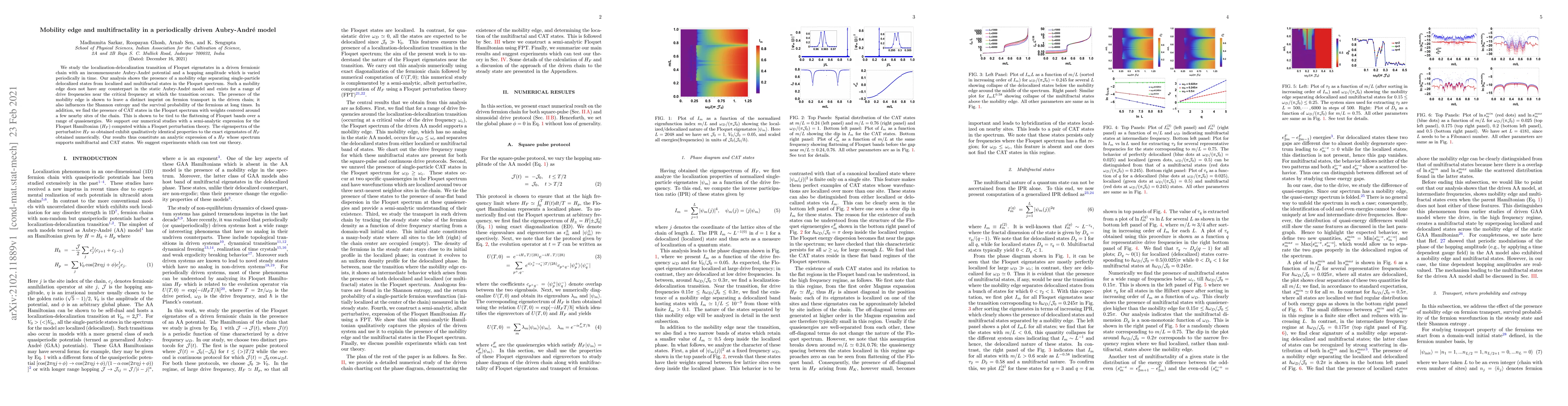 We study the localization-delocalization transition of Floquet eigenstates in a driven fermionic chain with an incommensurate Aubry-Andr\'{e} potential and a hopping amplitude which is varied periodically in time. Our analysis shows the presence of a mobility edge separating single-particle delocalized states from localized and multifractal states in the Floquet spectrum. Such a mobility edge does not have any counterpart in the static Aubry-Andr\'{e} model and exists for a range of drive frequencies near the critical frequency at which the transition occurs. The presence of the mobility edge is shown to leave a distinct imprint on fermion transport in the driven chain; it also influences the Shannon entropy and the survival probability of the fermions at long times. In addition, we find the presence of CAT states in the Floquet spectrum with weights centered around a few nearby sites of the chain. This is shown to be tied to the flattening of Floquet bands over a range of quasienergies. We support our numerical studies with a semi-analytic expression for the Floquet Hamiltonian ($H_F$) computed within a Floquet perturbation theory. The eigenspectra of the perturbative $H_F$ so obtained exhibit qualitatively identical properties to the exact eigenstates of $H_F$ obtained numerically. Our results thus constitute an analytic expression of a $H_F$ whose spectrum supports multifractal and CAT states. We suggest experiments which can test our theory.
