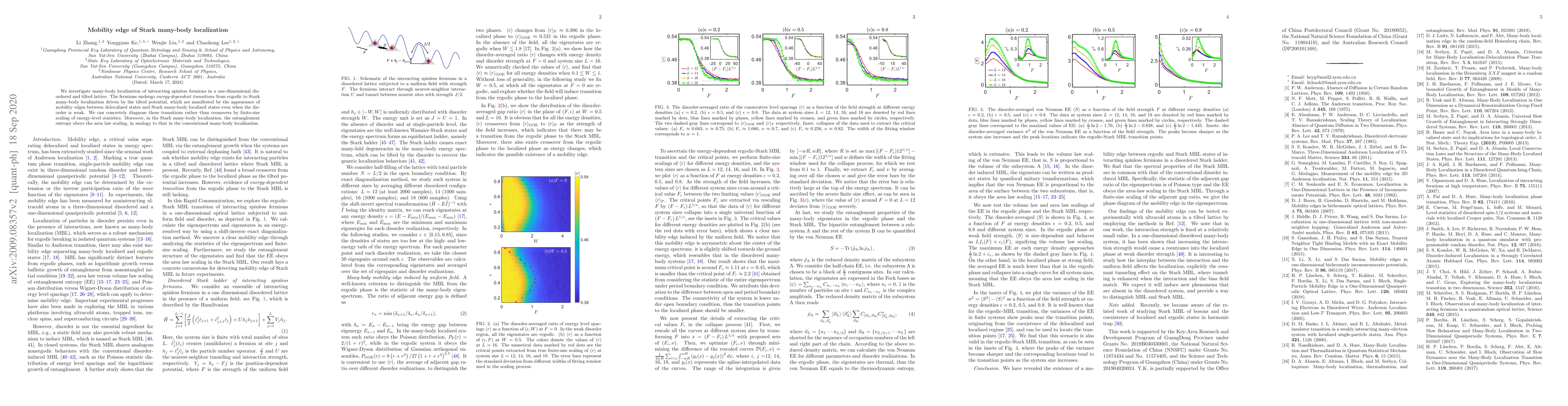 This study examines the transition of interacting spinless fermions in a disordered lattice from ergodic to Stark many-body localization under a tilted potential, revealing mobility edges through finite-size scaling of energy-level statistics. The entanglement entropy in Stark many-body localization follows an area law, similar to conventional many-body localization.