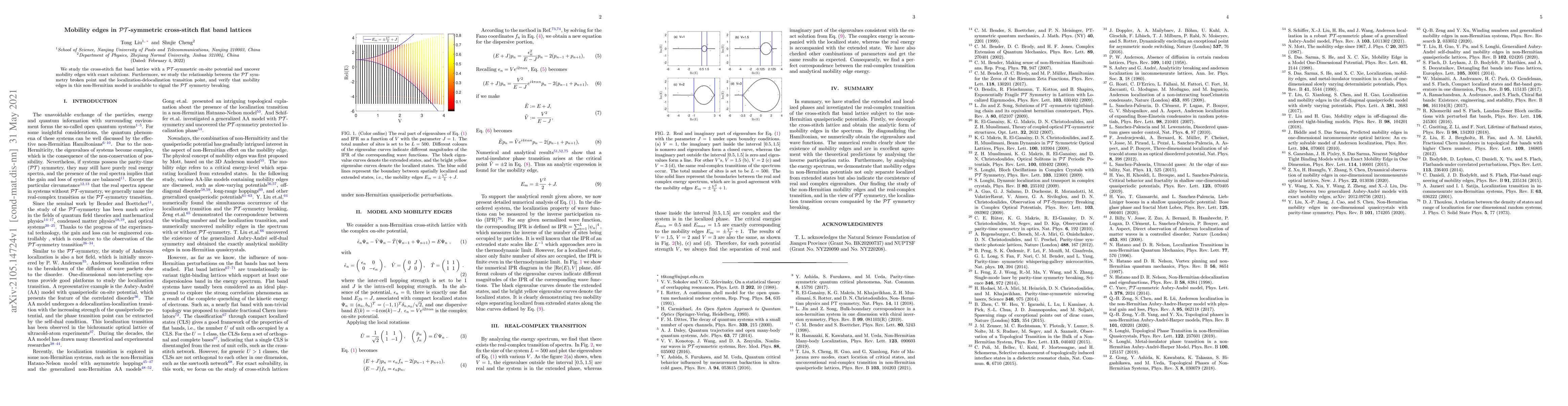 This paper investigates the cross-stitch flat band lattice with $\mathcal{PT}$-symmetric potential, revealing mobility edges through exact solutions. It also explores the connection between $\mathcal{PT}$ symmetry breaking and the localization-delocalization transition, confirming that mobility edges indicate $\mathcal{PT}$ symmetry breaking in this non-Hermitian model.