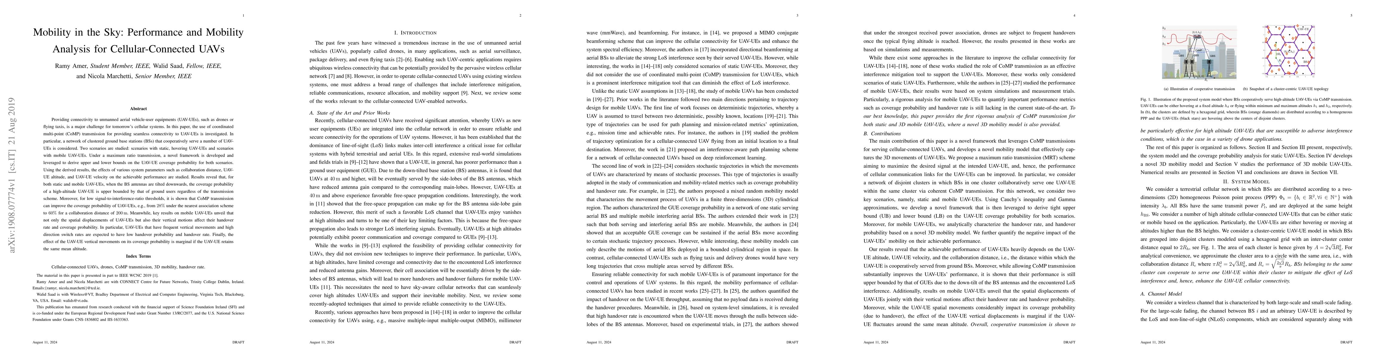 A study investigates the performance and mobility analysis for cellular-connected UAVs using coordinated multi-point transmission, revealing that tilted BS antennas improve coverage probability for high-altitude UAV-UEs.