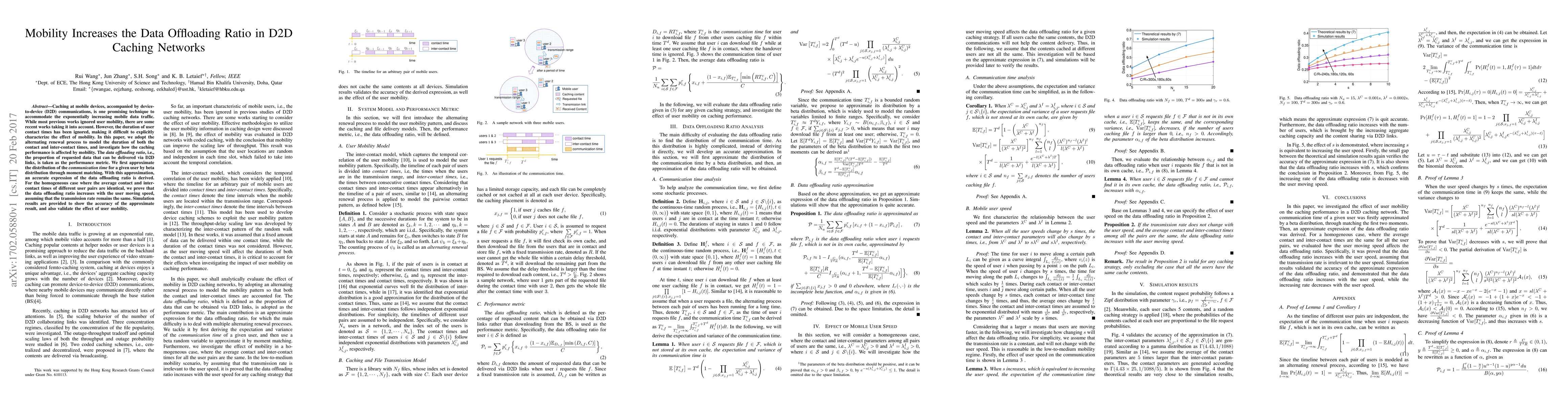 This paper models user mobility in D2D caching networks using an alternating renewal process, demonstrating that higher user mobility increases the data offloading ratio. It approximates communication time distribution with a beta distribution and derives an expression for the data offloading ratio, proving that faster user movement enhances offloading efficiency.