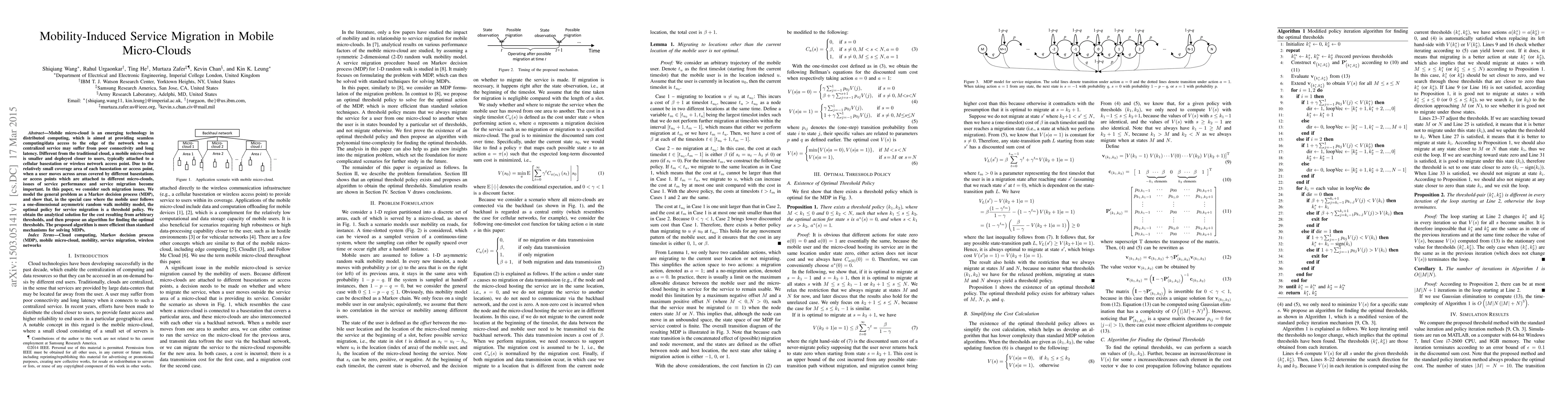 This paper investigates service migration in mobile micro-clouds, modeling it as a Markov decision process (MDP). It demonstrates that an optimal threshold policy minimizes migration costs under a one-dimensional asymmetric random walk mobility model, proposing an efficient algorithm to determine these thresholds.