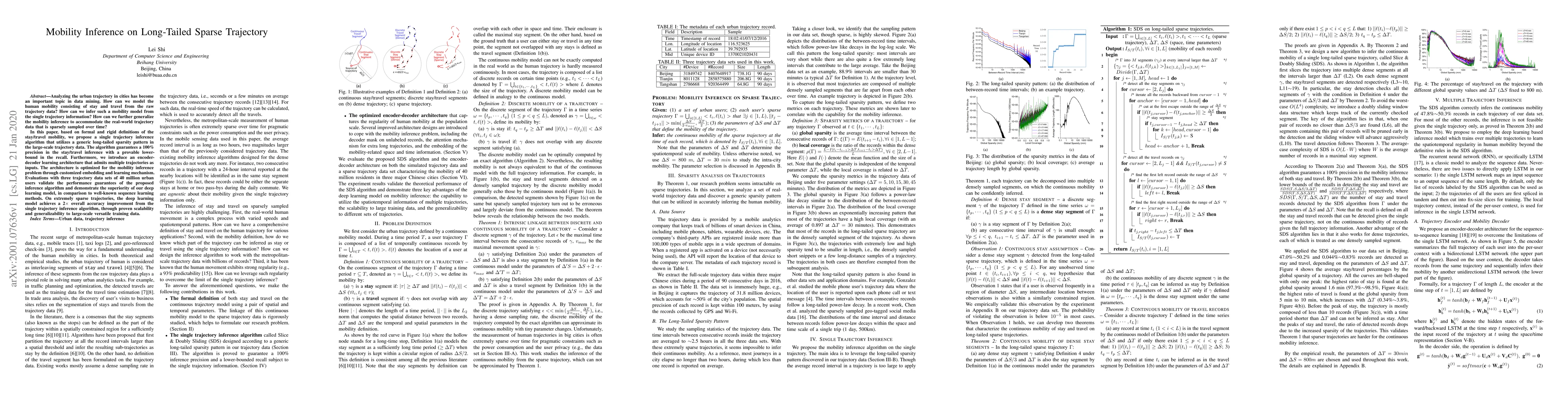 Analyzing the urban trajectory in cities has become an important topic in data mining. How can we model the human mobility consisting of stay and travel from the raw trajectory data? How can we infer such a mobility model from the single trajectory information? How can we further generalize the mobility inference to accommodate the real-world trajectory data that is sparsely sampled over time? In this paper, based on formal and rigid definitions of the stay/travel mobility, we propose a single trajectory inference algorithm that utilizes a generic long-tailed sparsity pattern in the large-scale trajectory data. The algorithm guarantees a 100\% precision in the stay/travel inference with a provable lower-bound in the recall. Furthermore, we introduce an encoder-decoder learning architecture that admits multiple trajectories as inputs. The architecture is optimized for the mobility inference problem through customized embedding and learning mechanism. Evaluations with three trajectory data sets of 40 million urban users validate the performance guarantees of the proposed inference algorithm and demonstrate the superiority of our deep learning model, in comparison to well-known sequence learning methods. On extremely sparse trajectories, the deep learning model achieves a 2$\times$ overall accuracy improvement from the single trajectory inference algorithm, through proven scalability and generalizability to large-scale versatile training data.