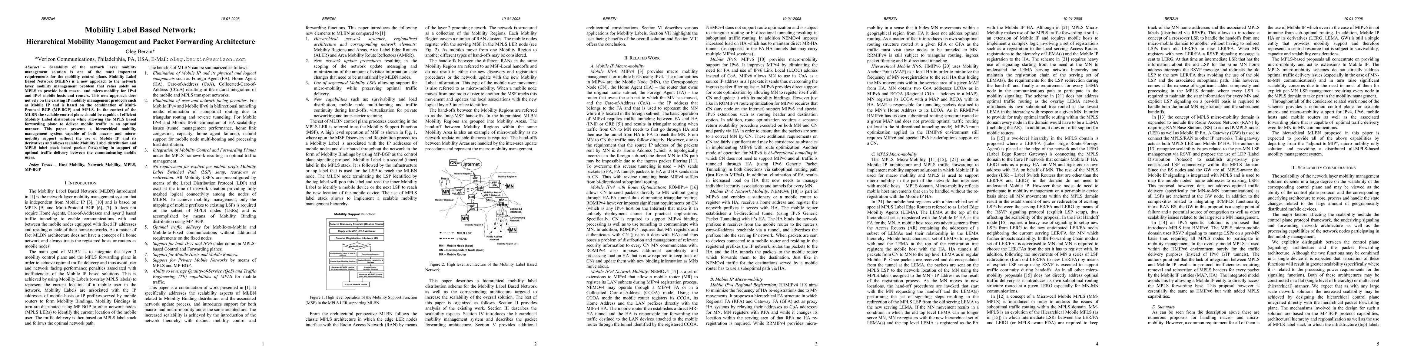 This paper introduces the Mobility Label Based Network (MLBN) approach, which leverages MPLS and Multi-Protocol BGP for scalable network layer mobility management, providing both macro- and micro-mobility support without relying on Mobile IP. It presents a hierarchical system for efficient Mobility Label distribution and MPLS-based packet forwarding for optimal traffic delivery.