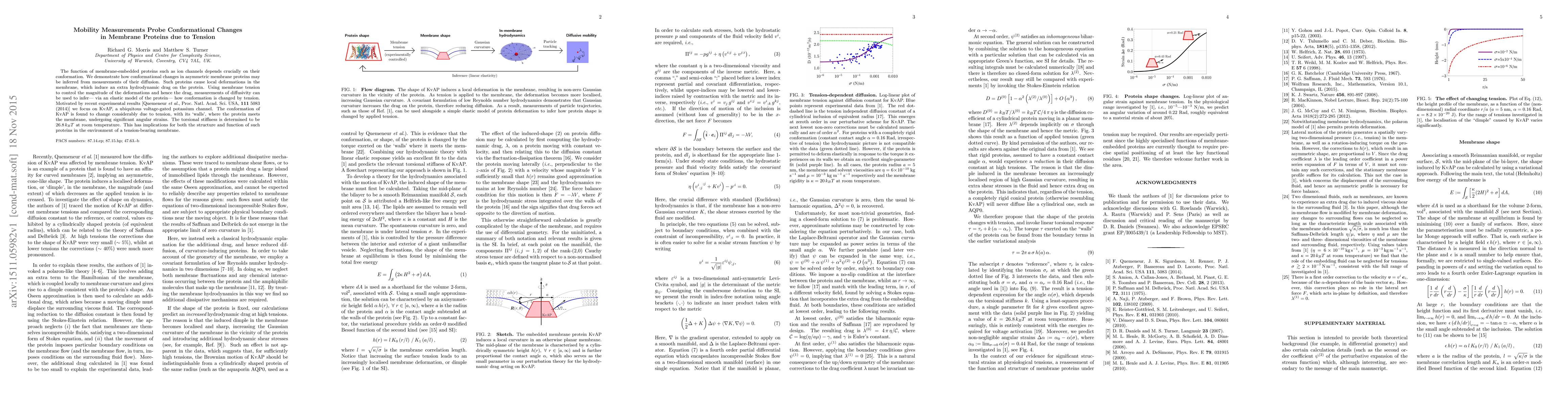This study demonstrates that diffusion measurements can reveal conformational changes in asymmetric membrane proteins, like KvAP, under membrane tension. By correlating diffusivity with induced hydrodynamic drag, researchers infer significant angular strains in KvAP's 'walls' and determine its torsional stiffness, highlighting the impact of tension on protein structure and function.
