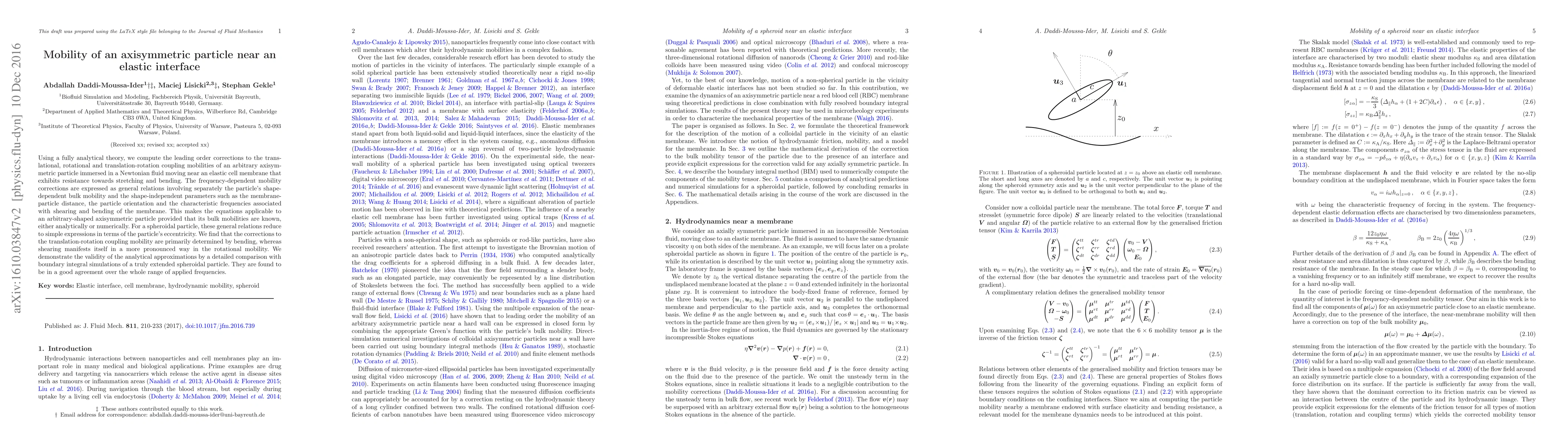 Using a fully analytical theory, we compute the leading order corrections to the translational, rotational and translation-rotation coupling mobilities of an arbitrary axisymmetric particle immersed in a Newtonian fluid moving near an elastic cell membrane that exhibits resistance towards stretching and bending. The frequency-dependent mobility corrections are expressed as general relations involving separately the particle's shape-dependent bulk mobility and the shape-independent parameters such as the membrane-particle distance, the particle orientation and the characteristic frequencies associated with shearing and bending of the membrane. This makes the equations applicable to an arbitrary-shaped axisymmetric particle provided that its bulk mobilities are known, either analytically or numerically. For a spheroidal particle, these general relations reduce to simple expressions in terms of the particle's eccentricity. We find that the corrections to the translation-rotation coupling mobility are primarily determined by bending, whereas shearing manifests itself in a more pronounced way in the rotational mobility. We demonstrate the validity of the analytical approximations by a detailed comparison with boundary integral simulations of a truly extended spheroidal particle. They are found to be in a good agreement over the whole range of applied frequencies.