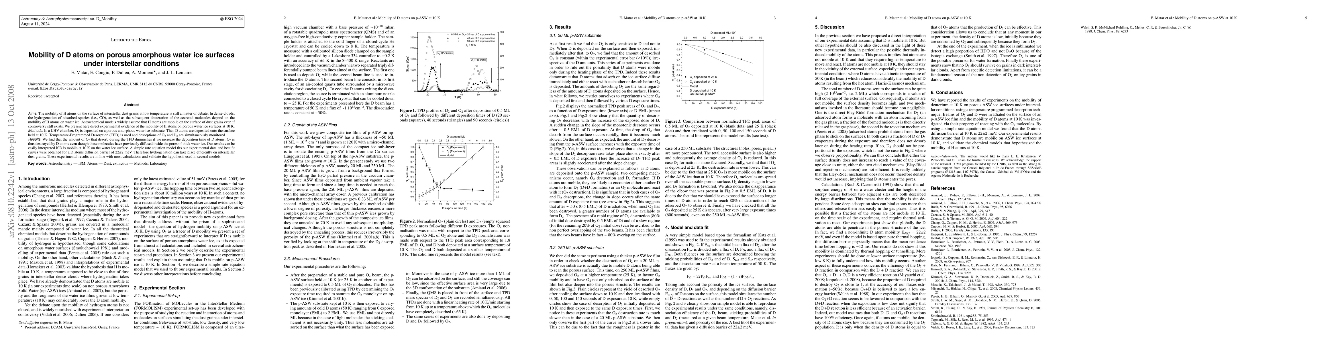 Aims. The mobility of H atoms on the surface of interstellar dust grains at low temperature is still a matter of debate. In dense clouds, the hydrogenation of adsorbed species (i.e., CO), as well as the subsequent deuteration of the accreted molecules depend on the mobility of H atoms on water ice. Astrochemical models widely assume that H atoms are mobile on the surface of dust grains even if controversy still exists. We present here direct experimental evidence of the mobility of H atoms on porous water ice surfaces at 10 K. Methods. In a UHV chamber, O2 is deposited on a porous amorphous water ice substrate. Then D atoms are deposited onto the surface held at 10 K. Temperature-Programmed Desorption (TPD) is used and desorptions of O2 and D2 are simultaneously monitored. Results. We find that the amount of O2 that desorb during the TPD diminishes if we increase the deposition time of D atoms. O2 is thus destroyed by D atoms even though these molecules have previously diffused inside the pores of thick water ice. Our results can be easily interpreted if D is mobile at 10 K on the water ice surface. A simple rate equation model fits our experimental data and best fit curves were obtained for a D atoms diffusion barrier of 22(+-)2 meV. Therefore hydrogenation can take place efficiently on interstellar dust grains. These experimental results are in line with most calculations and validate the hypothesis used in several models.