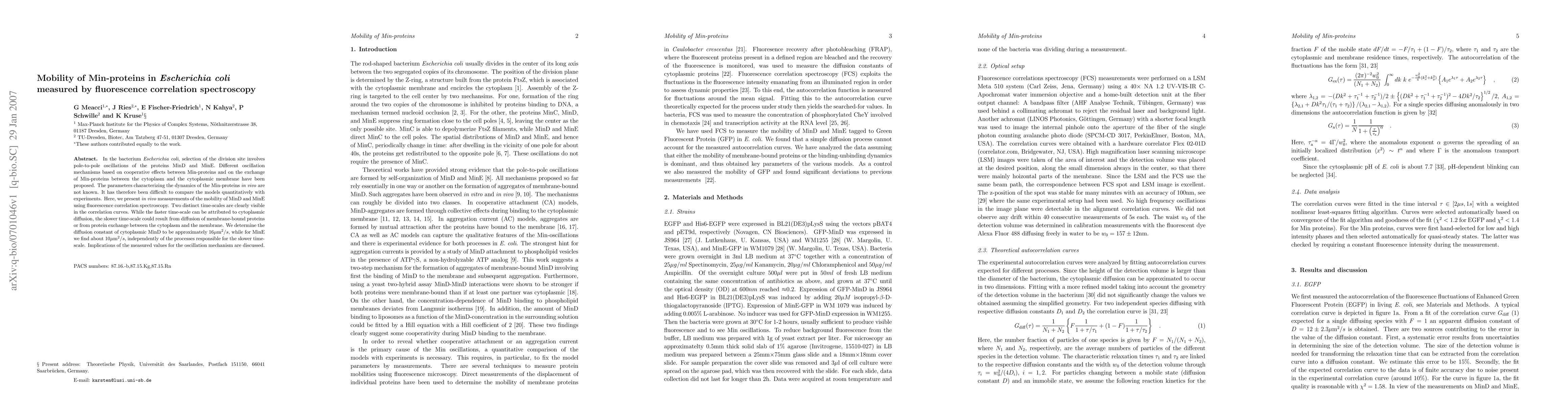 Researchers used fluorescence correlation spectroscopy to measure the mobility of MinD and MinE proteins in Escherichia coli, finding two distinct time-scales that suggest protein exchange between cytoplasm and membrane plays a role in division site selection.