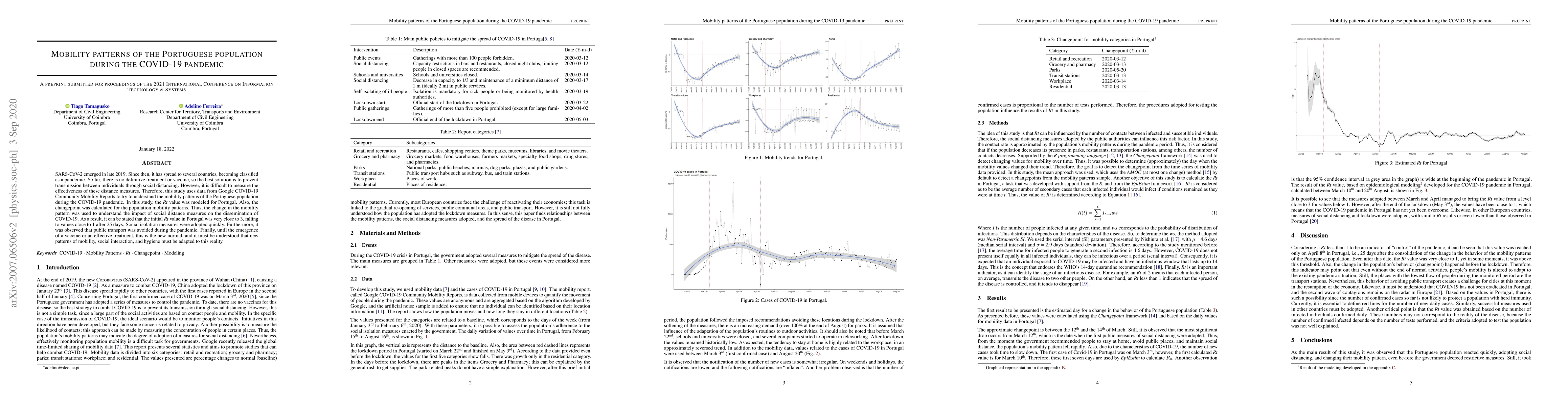 SARS-CoV-2 emerged in late 2019. Since then, it has spread to several countries, becoming classified as a pandemic. So far, there is no definitive treatment or vaccine, so the best solution is to prevent transmission between individuals through social distancing. However, it is difficult to measure the effectiveness of these distance measures. Therefore, this study uses data from Google COVID-19 Community Mobility Reports to try to understand the mobility patterns of the Portuguese population during the COVID-19 pandemic. In this study, the Rt value was modeled for Portugal. Also, the changepoint was calculated for the population mobility patterns. Thus, the change in the mobility pattern was used to understand the impact of social distance measures on the dissemination of COVID-19. As a result, it can be stated that the initial Rt value in Portugal was very close to 3, falling to values close to 1 after 25 days. Social isolation measures were adopted quickly. Furthermore, it was observed that public transport was avoided during the pandemic. Finally, until the emergence of a vaccine or an effective treatment, this is the new normal, and it must be understood that new patterns of mobility, social interaction, and hygiene must be adapted to this reality.