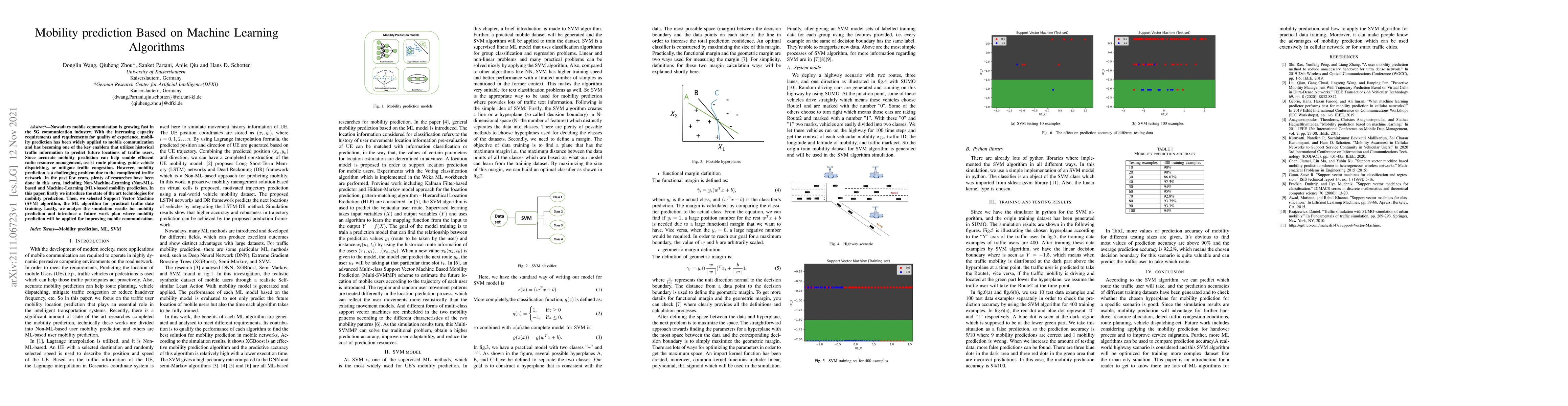 Nowadays mobile communication is growing fast in the 5G communication industry. With the increasing capacity requirements and requirements for quality of experience, mobility prediction has been widely applied to mobile communication and has becoming one of the key enablers that utilizes historical traffic information to predict future locations of traffic users, Since accurate mobility prediction can help enable efficient radio resource management, assist route planning, guide vehicle dispatching, or mitigate traffic congestion. However, mobility prediction is a challenging problem due to the complicated traffic network. In the past few years, plenty of researches have been done in this area, including Non-Machine-Learning (Non-ML)- based and Machine-Learning (ML)-based mobility prediction. In this paper, firstly we introduce the state of the art technologies for mobility prediction. Then, we selected Support Vector Machine (SVM) algorithm, the ML algorithm for practical traffic date training. Lastly, we analyse the simulation results for mobility prediction and introduce a future work plan where mobility prediction will be applied for improving mobile communication.