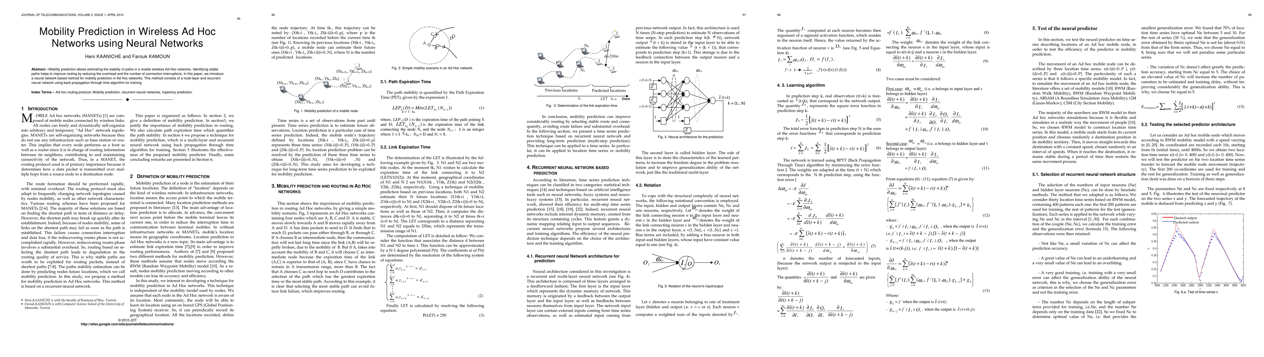 This paper proposes a neural network-based method for predicting mobility in wireless Ad Hoc networks to enhance routing stability, utilizing a multi-layer recurrent neural network trained with back propagation through time. The approach aims to reduce overhead and connection interruptions by identifying stable paths.