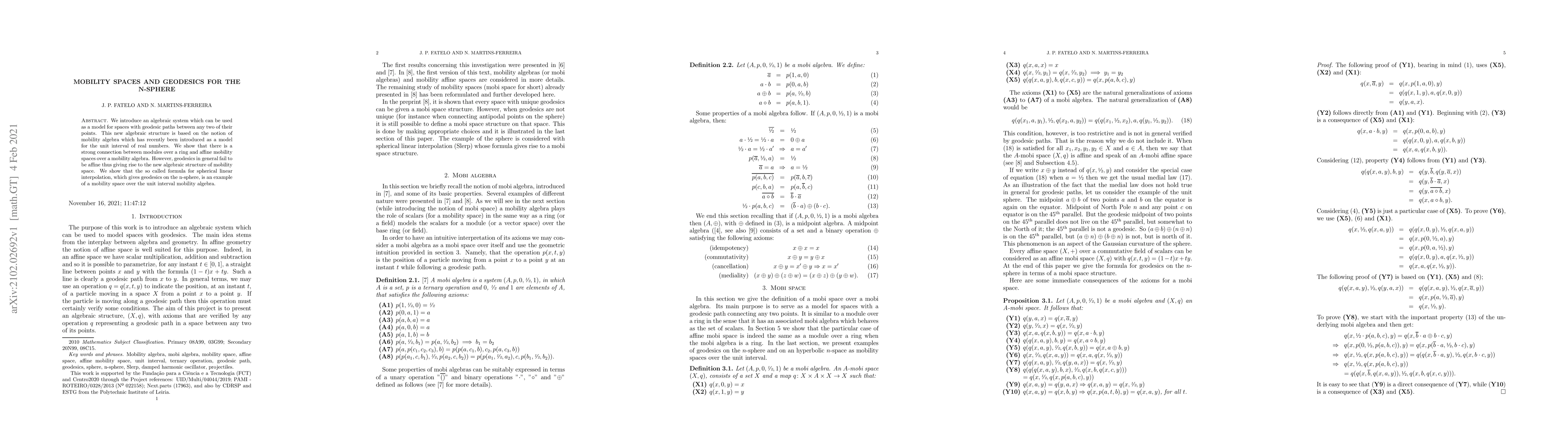 This paper introduces an algebraic system for modeling spaces with geodesic paths, termed mobility algebra, and demonstrates its connection to modules over a ring. It highlights that while geodesics often fail to be affine, they exemplify the new algebraic structure of mobility space, particularly in the context of spherical linear interpolation on the n-sphere.