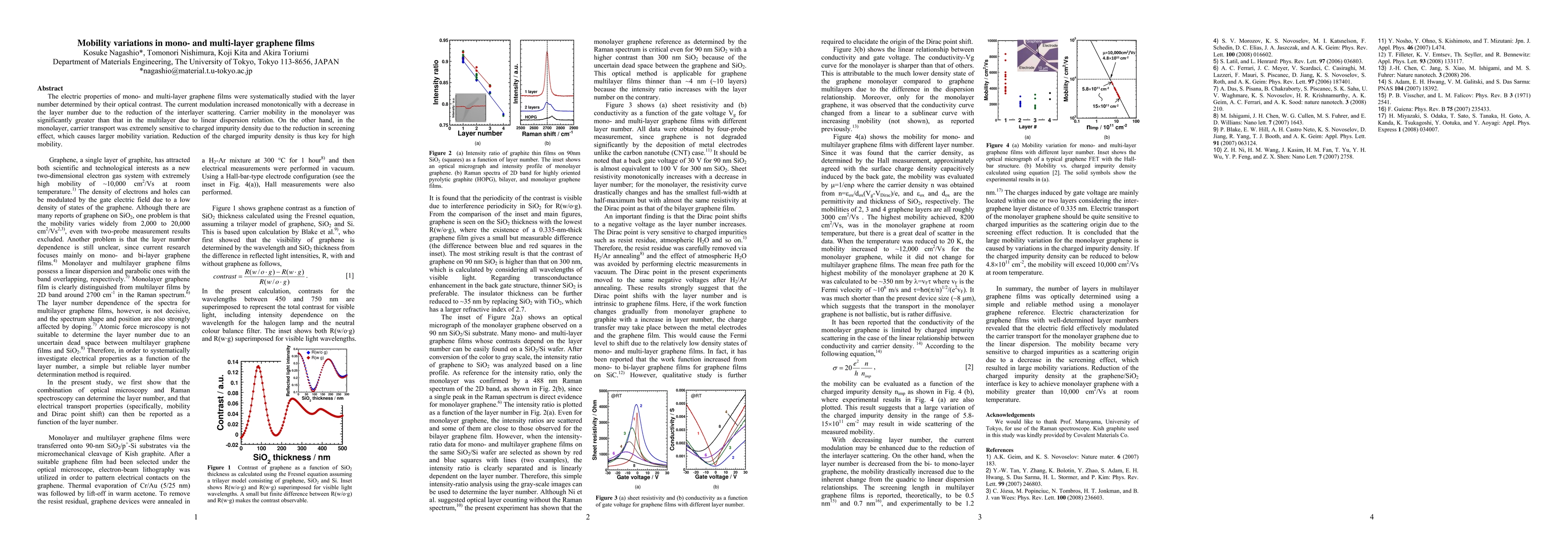 The electric properties of mono- and multi-layer graphene films were systematically studied with the layer number determined by their optical contrast. The current modulation increased monotonically with a decrease in the layer number due to the reduction of the interlayer scattering. Carrier mobility in the monolayer was significantly greater than that in the multilayer due to linear dispersion relation. On the other hand, in the monolayer, carrier transport was extremely sensitive to charged impurity density due to the reduction in screening effect, which causes larger mobility variation. Reduction of the charged impurity density is thus key for high mobility.