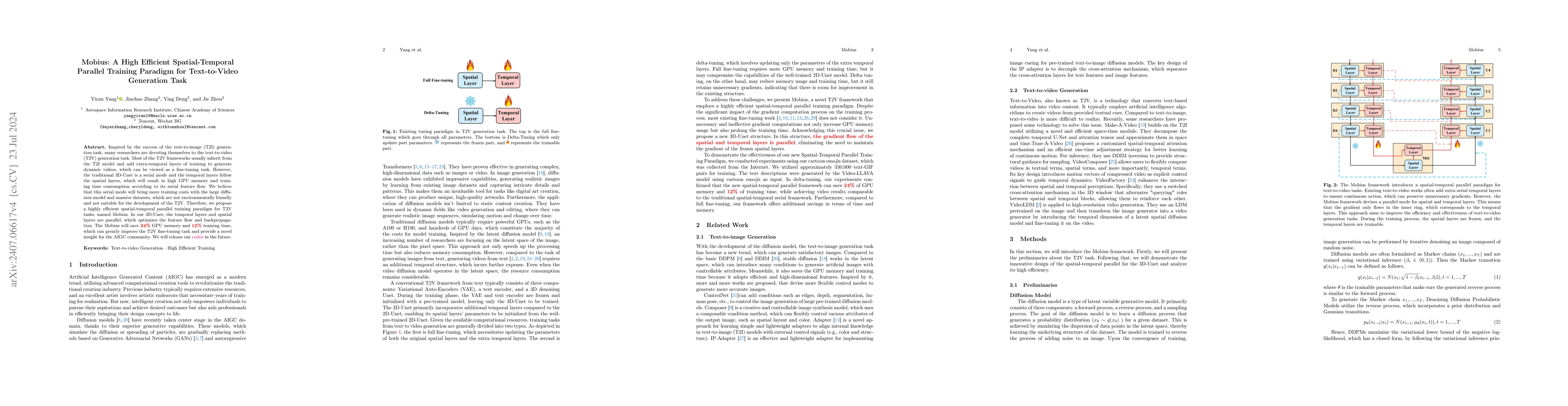 Mobius introduces a spatial-temporal parallel training paradigm to significantly enhance text-to-video generation efficiency by optimizing GPU memory usage and reducing training time. This method parallelizes temporal and spatial layers in the 3D-Unet framework, achieving a 24% reduction in memory and a 12% decrease in training time.
