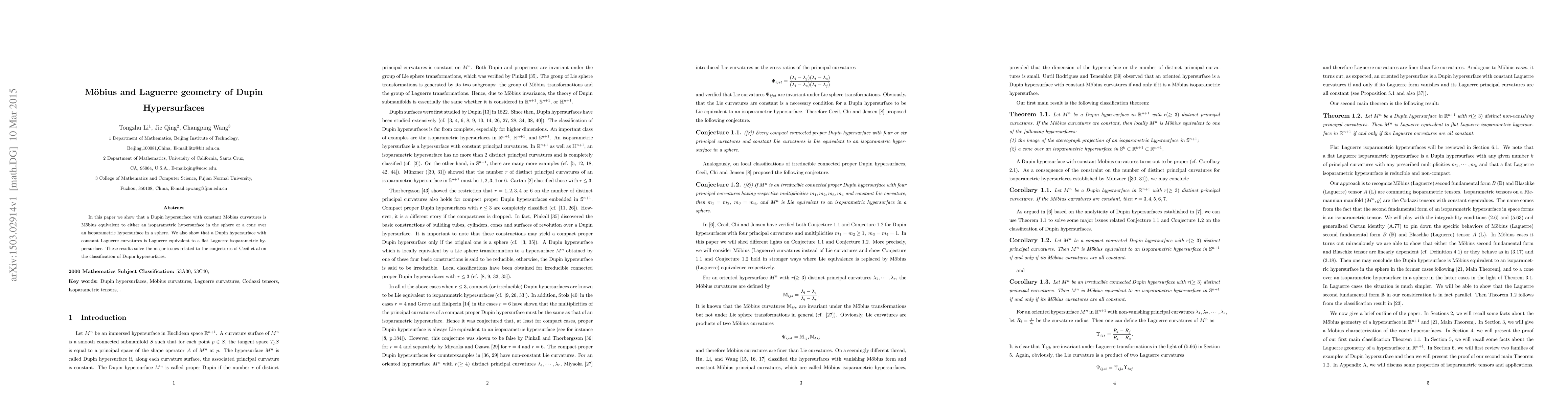 In this paper we show that a Dupin hypersurface with constant M\"{o}bius curvatures is M\"{o}bius equivalent to either an isoparametric hypersurface in the sphere or a cone over an isoparametric hypersurface in a sphere. We also show that a Dupin hypersurface with constant Laguerre curvatures is Laguerre equivalent to a flat Laguerre isoparametric hypersurface. These results solve the major issues related to the conjectures of Cecil et al on the classification of Dupin hypersurfaces.