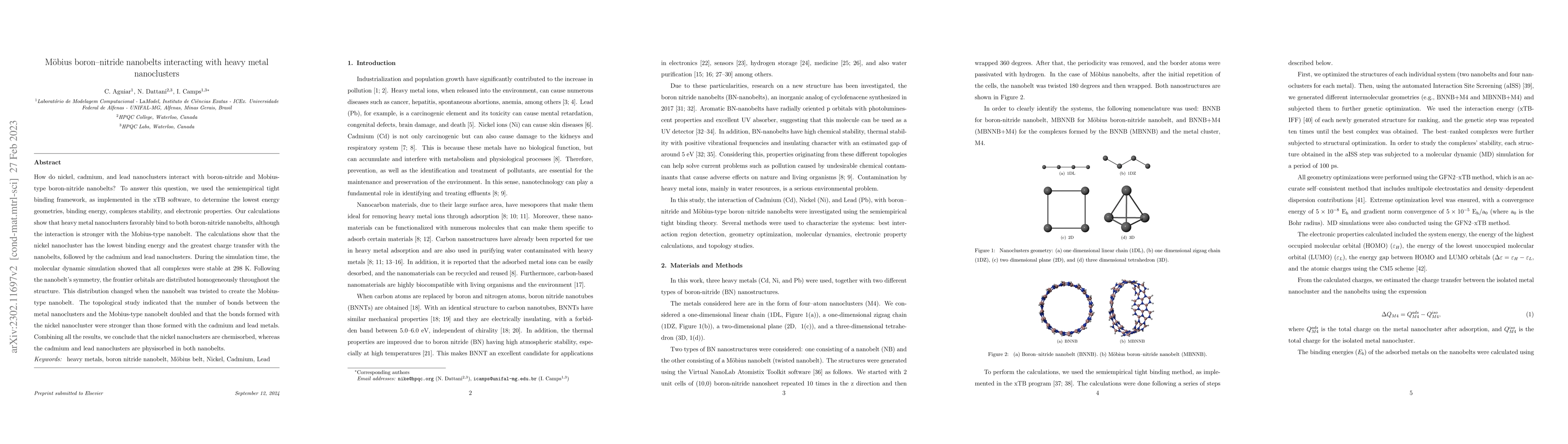 How do nickel, cadmium, and lead nanoclusters interact with boron-nitride and Mobius-type boron-nitride nanobelts? To answer this question, we used the semiempirical tight binding framework, as implemented in the xTB software, to determine the lowest energy geometries, binding energy, complexes stability, and electronic properties. Our calculations show that heavy metal nanoclusters favorably bind to both boron-nitride nanobelts, although the interaction is stronger with the Mobius-type nanobelt. The calculations show that the nickel nanocluster has the lowest binding energy and the greatest charge transfer with the nanobelts, followed by the cadmium and lead nanoclusters. During the simulation time, the molecular dynamic simulation showed that all complexes were stable at 298 K. Following the nanobelt's symmetry, the frontier orbitals are distributed homogeneously throughout the structure. This distribution changed when the nanobelt was twisted to create the Mobius-type nanobelt. The topological study indicated that the number of bonds between the metal nanoclusters and the Mobius-type nanobelt doubled and that the bonds formed with the nickel nanocluster were stronger than those formed with the cadmium and lead metals. Combining all the results, we conclude that the nickel nanoclusters are chemisorbed, whereas the cadmium and lead nanoclusters are physisorbed in both nanobelts.