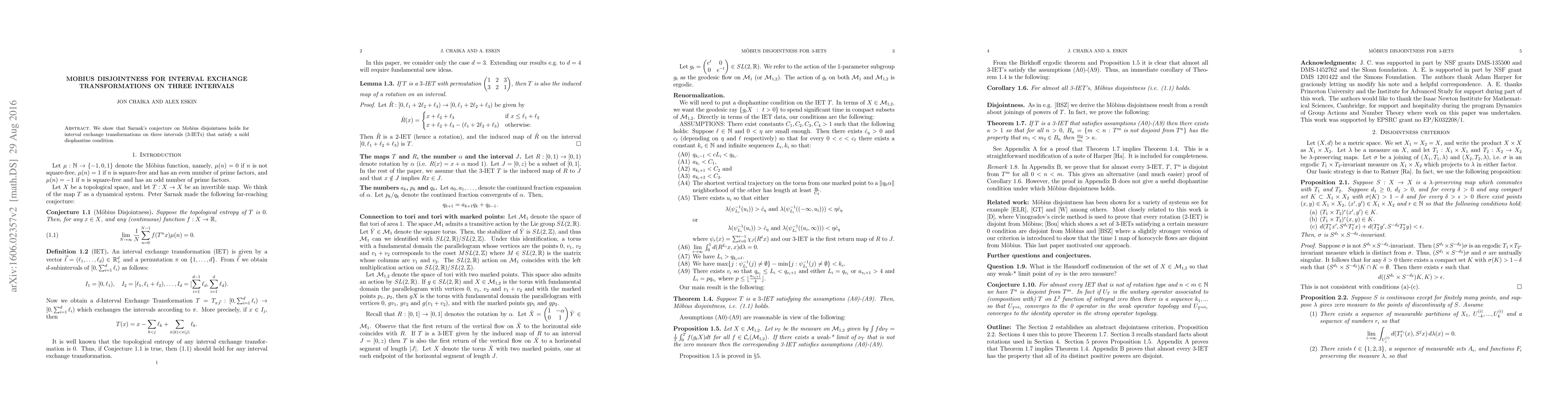 Summary: This paper proves Sarnak's conjecture on Möbius disjointness for 3-IETs under a mild diophantine condition, establishing the conjecture's validity for this specific class of transformations.