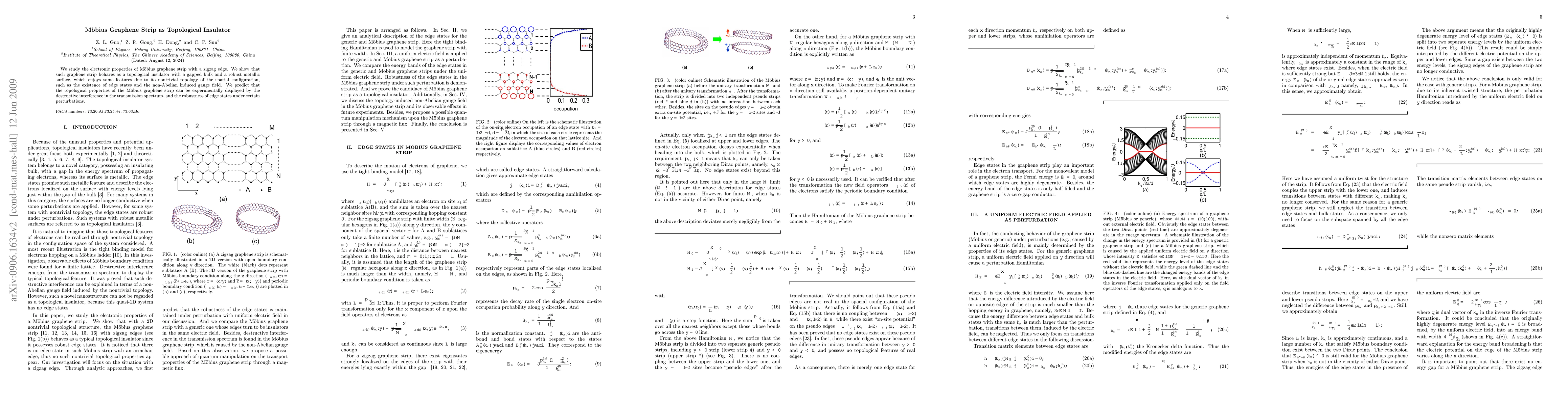 This paper investigates the electronic properties of Möbius graphene strips with zigzag edges, demonstrating their behavior as topological insulators with a gapped bulk and metallic surface states, underpinned by the strip's nontrivial topology. Experimental manifestations of these topological properties are predicted to include destructive interference in transmission spectra and robust edge states.