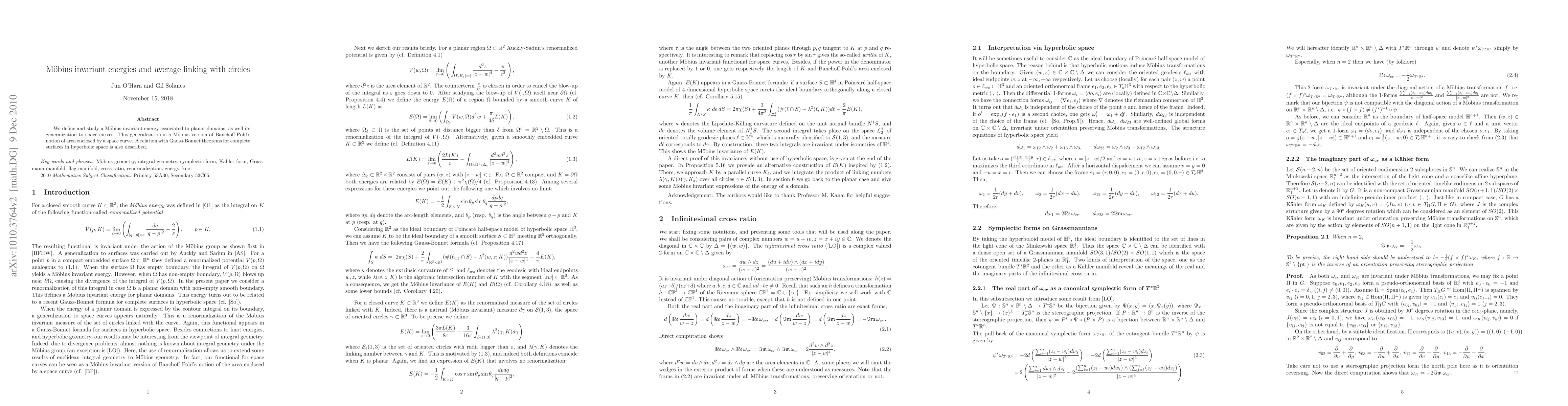 Summary: This paper introduces a Möbius invariant energy for planar domains and extends it to space curves, relating it to Gauss-Bonnet theorems and Banchoff-Pohl's notion of area enclosed by curves in hyperbolic space.