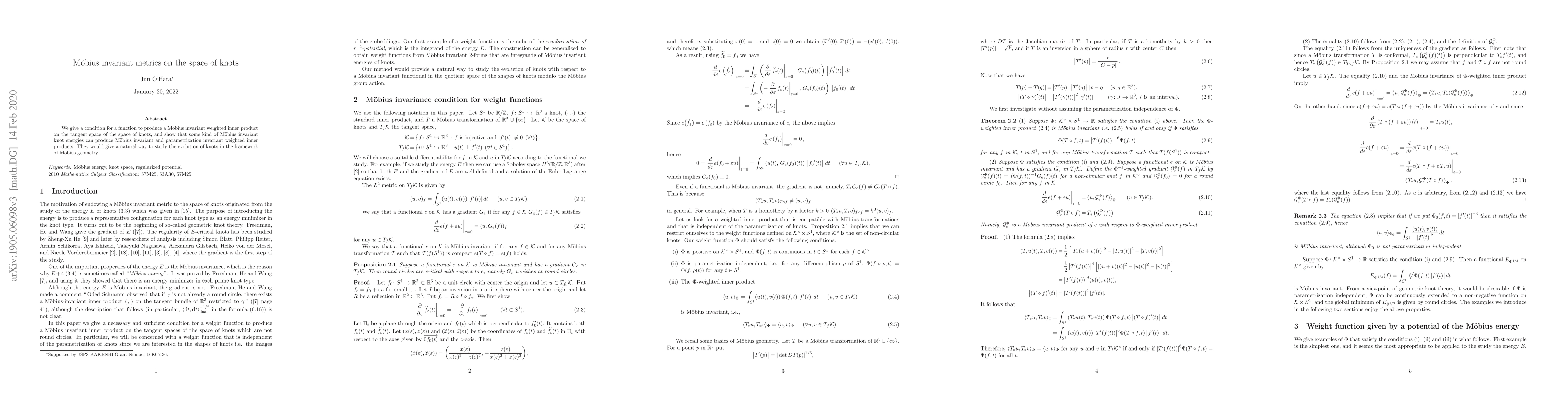 We give a condition for a function to produce a M\"obius invariant weighted inner product on the tangent space of the space of knots, and show that some kind of M\"obius invariant knot energies can produce M\"obius invariant and parametrization invariant weighted inner products. They would give a natural way to study the evolution of knots in the framework of M\"obius geometry.