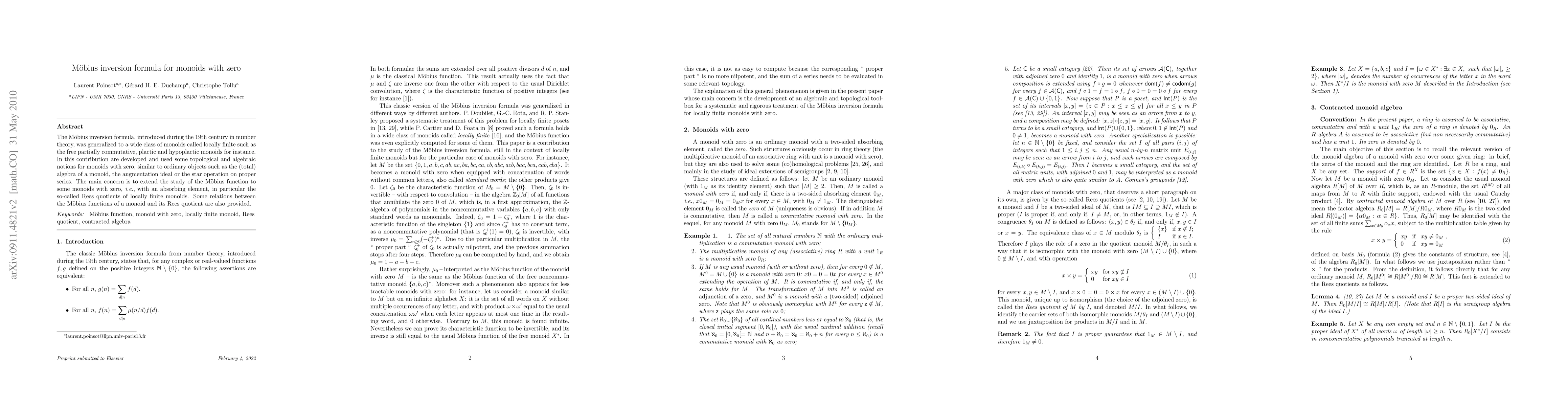 This paper generalizes the Möbius inversion formula to monoids with zero, extending its applicability to structures like free partially commutative monoids. It introduces topological and algebraic concepts for these monoids, focusing on the Möbius function and its relations in Rees quotients of locally finite monoids.