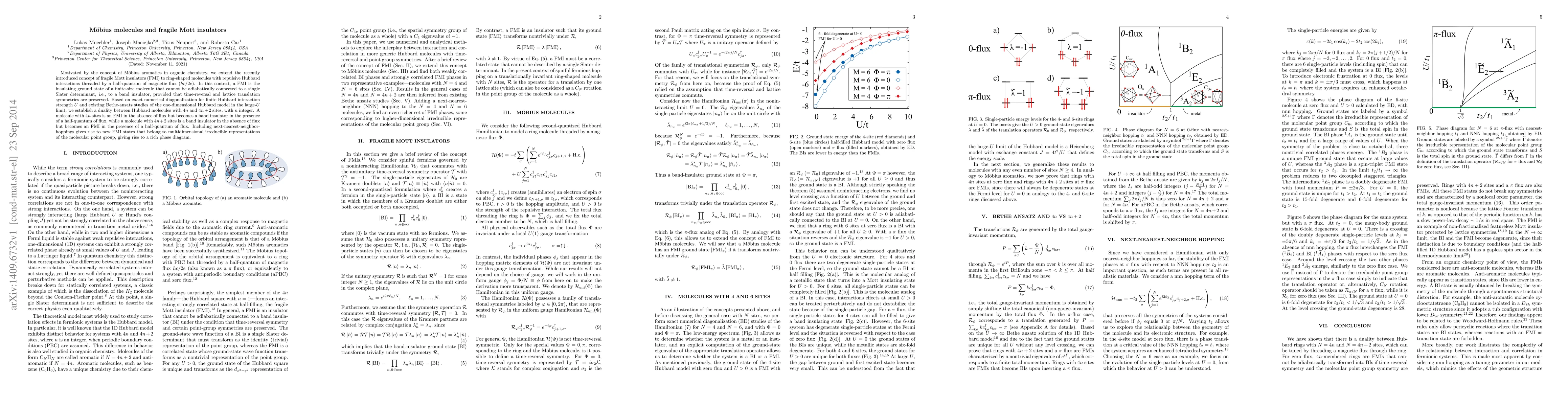 Motivated by the concept of M\"obius aromatics in organic chemistry, we extend the recently introduced concept of fragile Mott insulators (FMI) to ring-shaped molecules with repulsive Hubbard interactions threaded by a half-quantum of magnetic flux ($hc/2e$). In this context, a FMI is the insulating ground state of a finite-size molecule that cannot be adiabatically connected to a single Slater determinant, i.e., to a band insulator, provided that time-reversal and lattice translation symmetries are preserved. Based on exact numerical diagonalization for finite Hubbard interaction strength $U$ and existing Bethe-ansatz studies of the one-dimensional Hubbard model in the large-$U$ limit, we establish a duality between Hubbard molecules with $4n$ and $4n+2$ sites, with $n$ integer. A molecule with $4n$ sites is an FMI in the absence of flux but becomes a band insulator in the presence of a half-quantum of flux, while a molecule with $4n+2$ sites is a band insulator in the absence of flux but becomes an FMI in the presence of a half-quantum of flux. Including next-nearest-neighbor-hoppings gives rise to new FMI states that belong to multidimensional irreducible representations of the molecular point group, giving rise to a rich phase diagram.