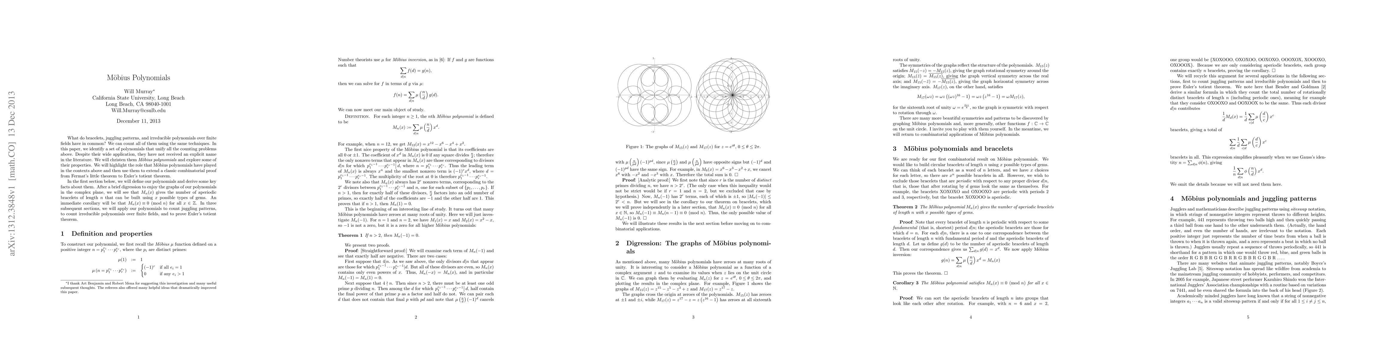 The paper introduces the M\"obius polynomial $M_n(x)$ that counts aperiodic bracelets and satisfies $M_n(x) \equiv 0$ (mod $n$). It explores properties, complex plane graphs, and combinatorial applications to juggling patterns, irreducible polynomials, and Euler's totient theorem.