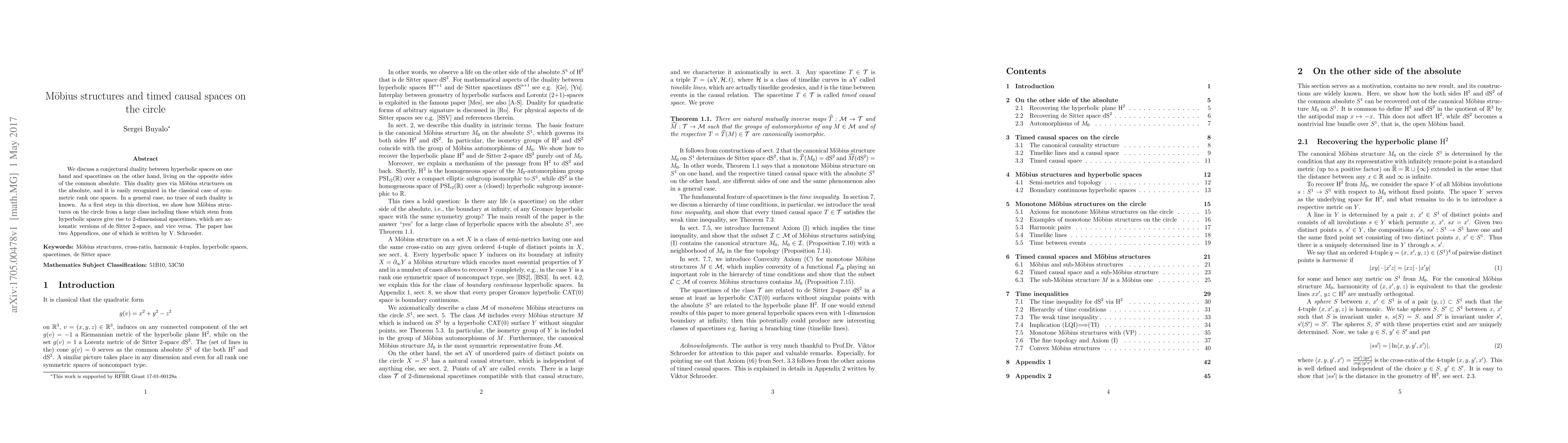 This paper explores a conjectured duality between hyperbolic spaces and spacetimes via Möbius structures on an absolute, demonstrating that Möbius structures on the circle lead to 2-dimensional spacetimes akin to de Sitter 2-space, and vice versa. The paper includes appendices, one contributed by V. Schroeder.