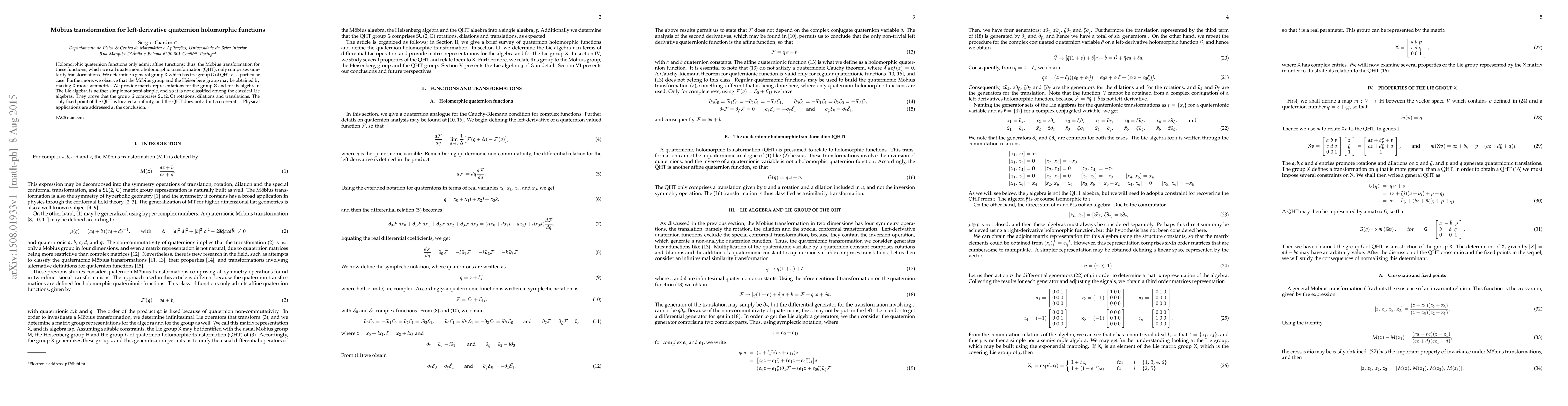 Holomorphic quaternion functions only admit affine functions; thus, the M\"obius transformation for these functions, which we call quaternionic holomorphic transformation (QHT), only comprises similarity transformations. We determine a general group $\mathsf{X}$ which has the group $\mathsf{G}$ of QHT as a particular case. Furthermore, we observe that the M\"obius group and the Heisenberg group may be obtained by making $\mathsf{X}$ more symmetric. We provide matrix representations for the group $\mathsf{X}$ and for its algebra $\mathfrak{x}$. The Lie algebra is neither simple nor semi-simple, and so it is not classified among the classical Lie algebras. They prove that the group $\mathsf{G}$ comprises $\mathsf{SU}(2,\mathbb{C})$ rotations, dilations and translations. The only fixed point of the QHT is located at infinity, and the QHT does not admit a cross-ratio. Physical applications are addressed at the conclusion.