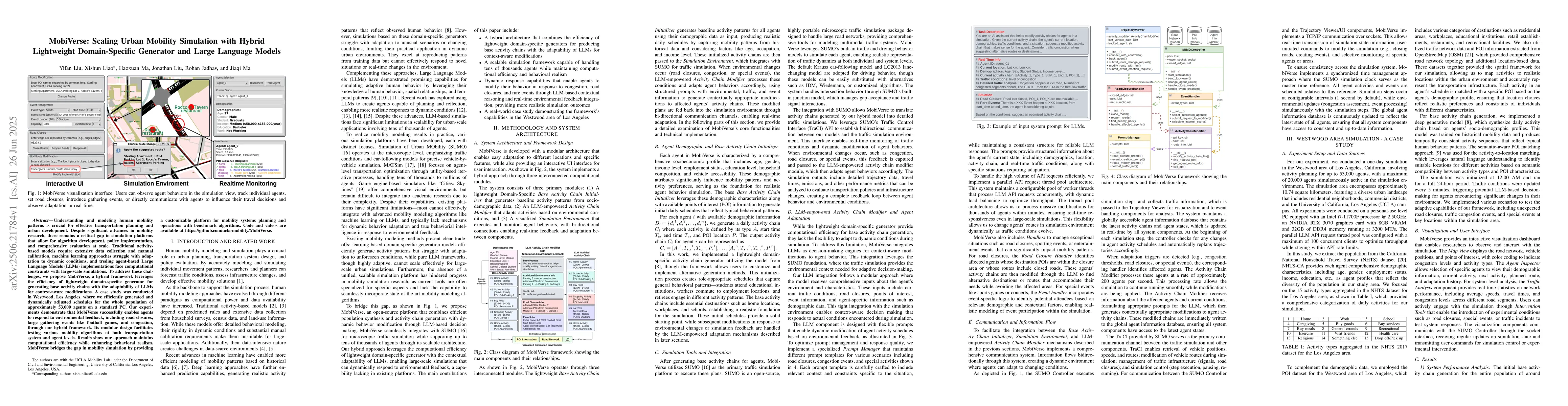 Understanding and modeling human mobility patterns is crucial for effective transportation planning and urban development. Despite significant advances in mobility research, there remains a critical gap in simulation platforms that allow for algorithm development, policy implementation, and comprehensive evaluation at scale. Traditional activity-based models require extensive data collection and manual calibration, machine learning approaches struggle with adaptation to dynamic conditions, and treding agent-based Large Language Models (LLMs) implementations face computational constraints with large-scale simulations. To address these challenges, we propose MobiVerse, a hybrid framework leverages the efficiency of lightweight domain-specific generator for generating base activity chains with the adaptability of LLMs for context-aware modifications. A case study was conducted in Westwood, Los Angeles, where we efficiently generated and dynamically adjusted schedules for the whole population of approximately 53,000 agents on a standard PC. Our experiments demonstrate that MobiVerse successfully enables agents to respond to environmental feedback, including road closures, large gathering events like football games, and congestion, through our hybrid framework. Its modular design facilitates testing various mobility algorithms at both transportation system and agent levels. Results show our approach maintains computational efficiency while enhancing behavioral realism. MobiVerse bridges the gap in mobility simulation by providing a customizable platform for mobility systems planning and operations with benchmark algorithms. Code and videos are available at https://github.com/ucla-mobility/MobiVerse.