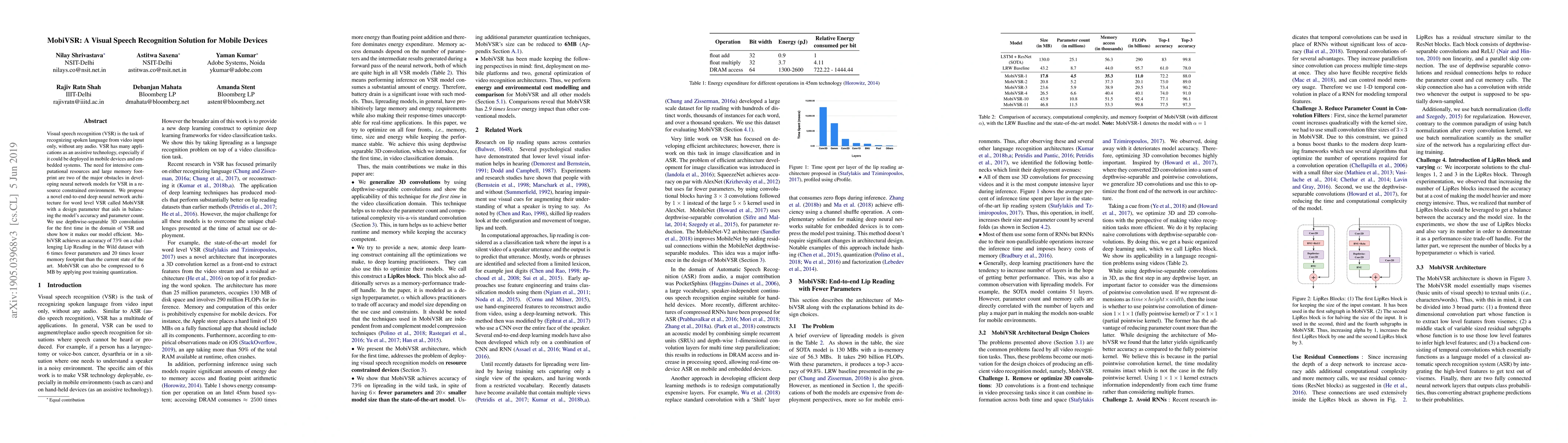 Researchers developed a new visual speech recognition system called MobiVSR that uses a novel neural network architecture to recognize spoken language from video input on mobile devices. It achieves high accuracy with significantly reduced parameters and memory footprint compared to existing state-of-the-art systems.
