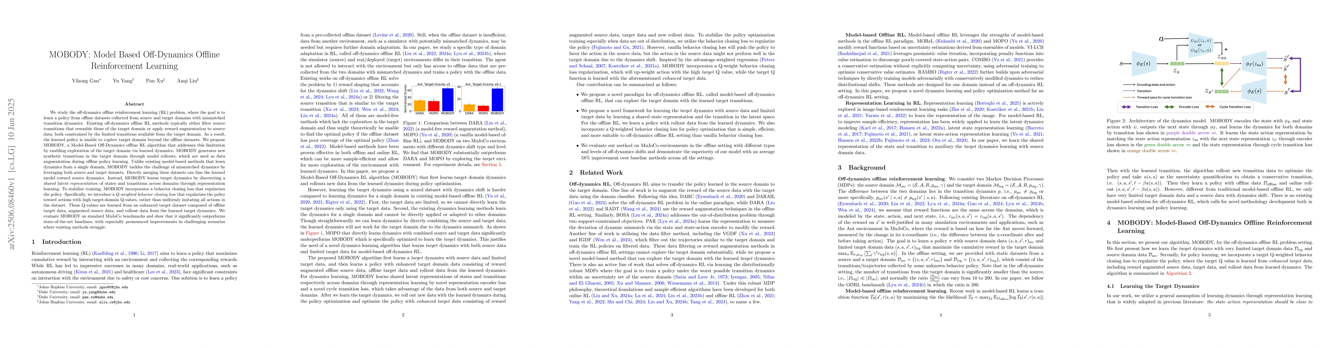 MOBODY is a Model-Based Off-Dynamics offline RL algorithm that generates synthetic transitions in target domains through learned dynamics, improving performance on challenging scenarios.