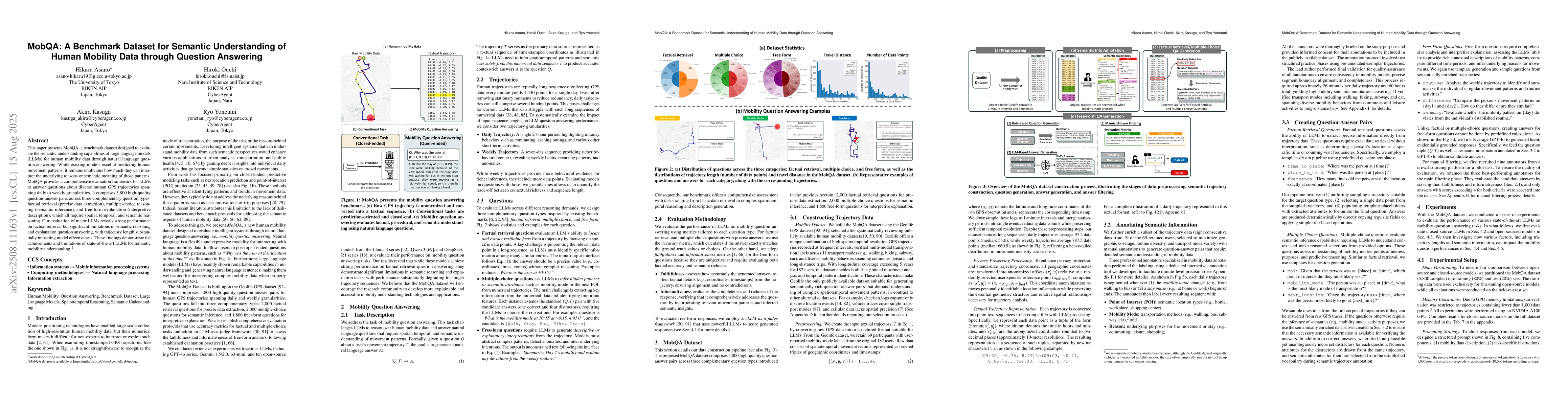 This paper presents MobQA, a benchmark dataset designed to evaluate the semantic understanding capabilities of large language models (LLMs) for human mobility data through natural language question answering. While existing models excel at predicting human movement patterns, it remains unobvious how much they can interpret the underlying reasons or semantic meaning of those patterns. MobQA provides a comprehensive evaluation framework for LLMs to answer questions about diverse human GPS trajectories spanning daily to weekly granularities. It comprises 5,800 high-quality question-answer pairs across three complementary question types: factual retrieval (precise data extraction), multiple-choice reasoning (semantic inference), and free-form explanation (interpretive description), which all require spatial, temporal, and semantic reasoning. Our evaluation of major LLMs reveals strong performance on factual retrieval but significant limitations in semantic reasoning and explanation question answering, with trajectory length substantially impacting model effectiveness. These findings demonstrate the achievements and limitations of state-of-the-art LLMs for semantic mobility understanding.\footnote{MobQA dataset is available at https://github.com/CyberAgentAILab/mobqa.}
