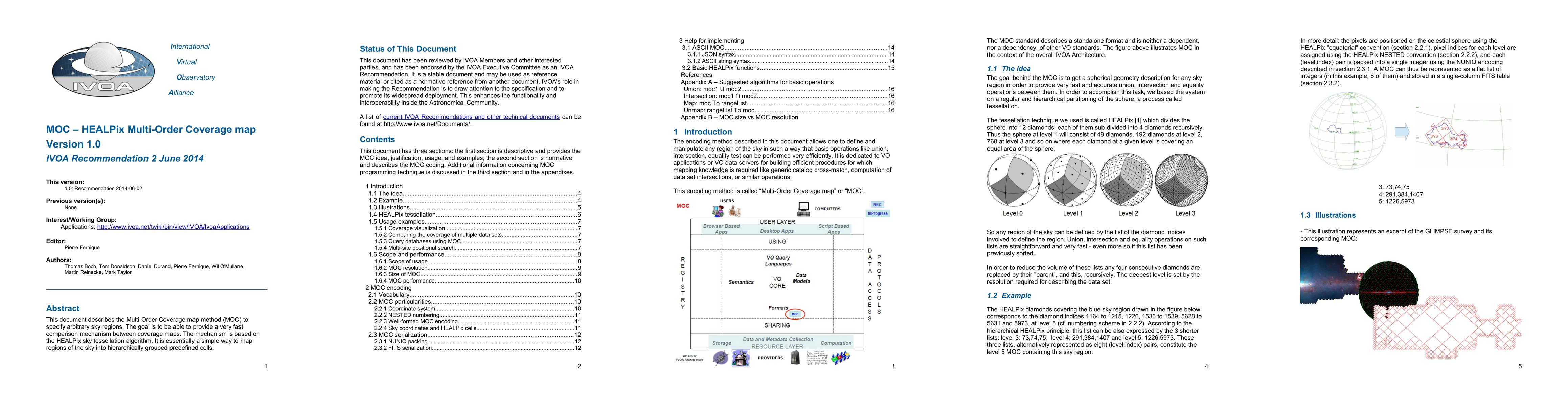 This document describes the Multi-Order Coverage map method (MOC) to specify arbitrary sky regions. The goal is to be able to provide a very fast comparison mechanism between coverage maps. The mechanism is based on the HEALPix sky tessellation algorithm. It is essentially a simple way to map regions of the sky into hierarchically grouped predefined cells.
