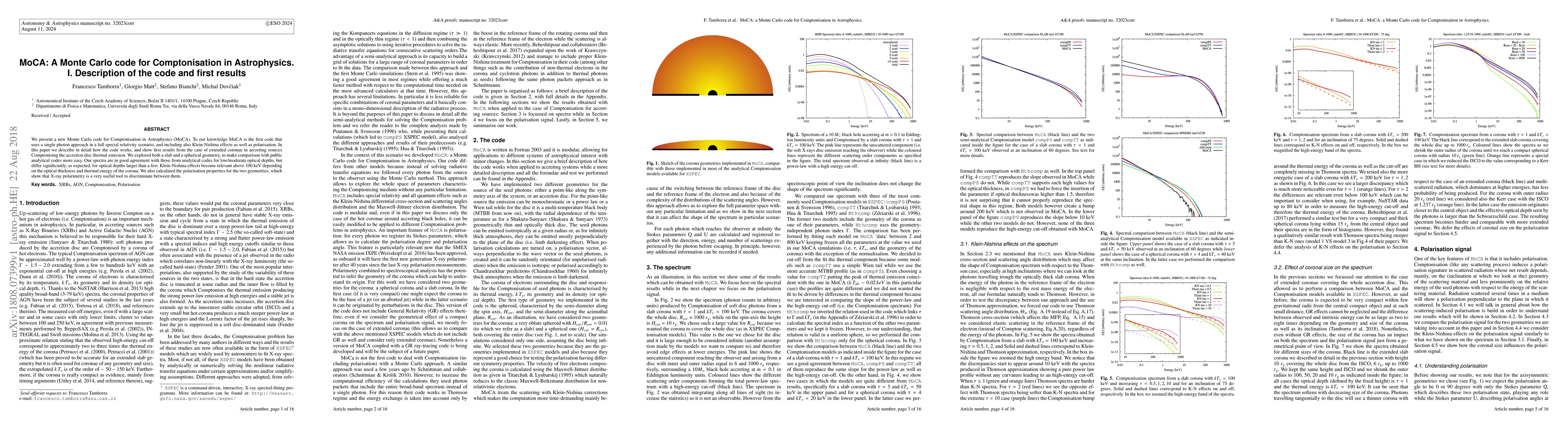 MoCA is a novel Monte Carlo code for astrophysical Comptonisation that uses a single photon approach in a relativistic framework, including Klein-Nishina effects and polarisation. Initial results show good agreement with analytical codes for low/moderate optical depths, highlighting the importance of Klein-Nishina effects above 100 keV and the utility of X-ray polarimetry for distinguishing between different geometries.
