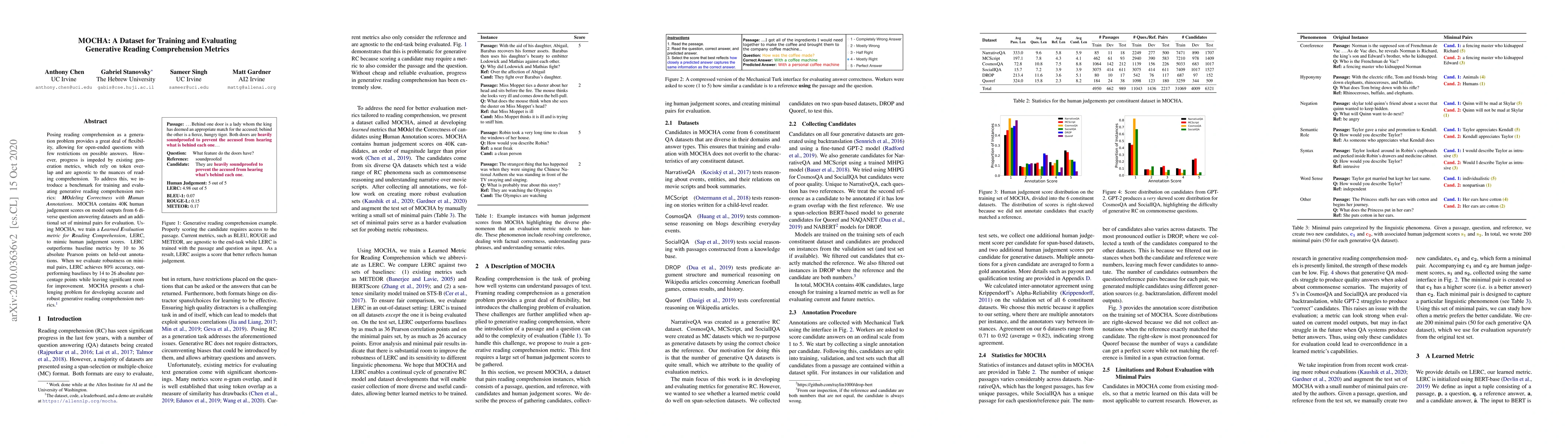 MOCHA is a new dataset designed to train and evaluate generative reading comprehension metrics, featuring 40K human judgement scores on model outputs from diverse question answering datasets. The LERC metric trained using MOCHA outperforms existing baselines significantly in both accuracy and robustness.
