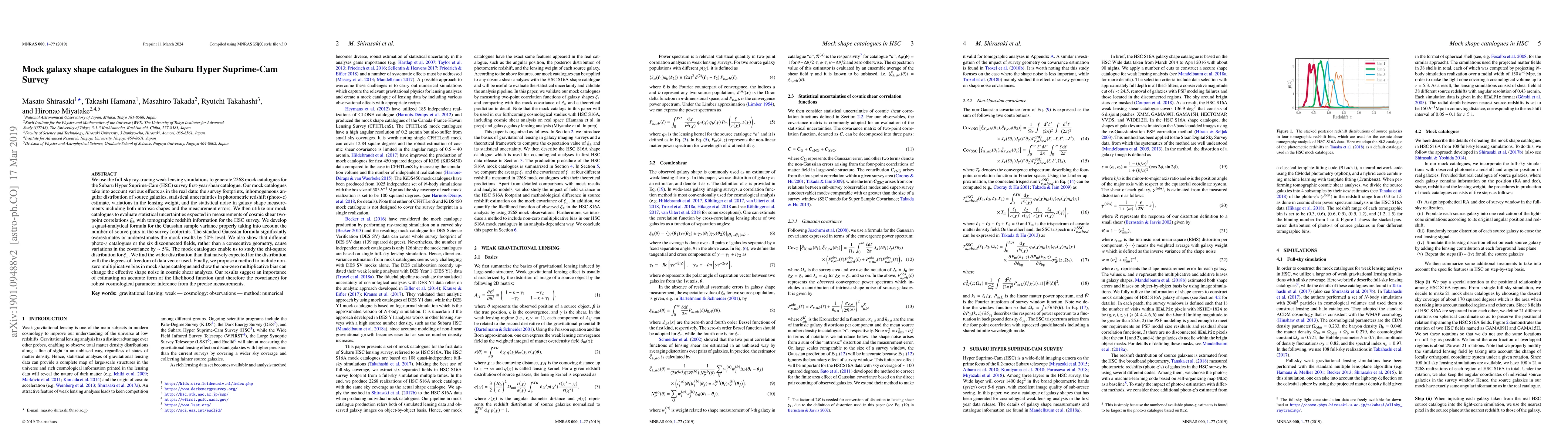 This paper generates 2268 mock galaxy shape catalogs for the Subaru Hyper Suprime-Cam Survey, accounting for various observational effects. It evaluates statistical uncertainties in cosmic shear measurements and proposes a quasi-analytical formula for Gaussian sample variance, highlighting the importance of accurate likelihood function estimation for robust cosmological parameter inference.