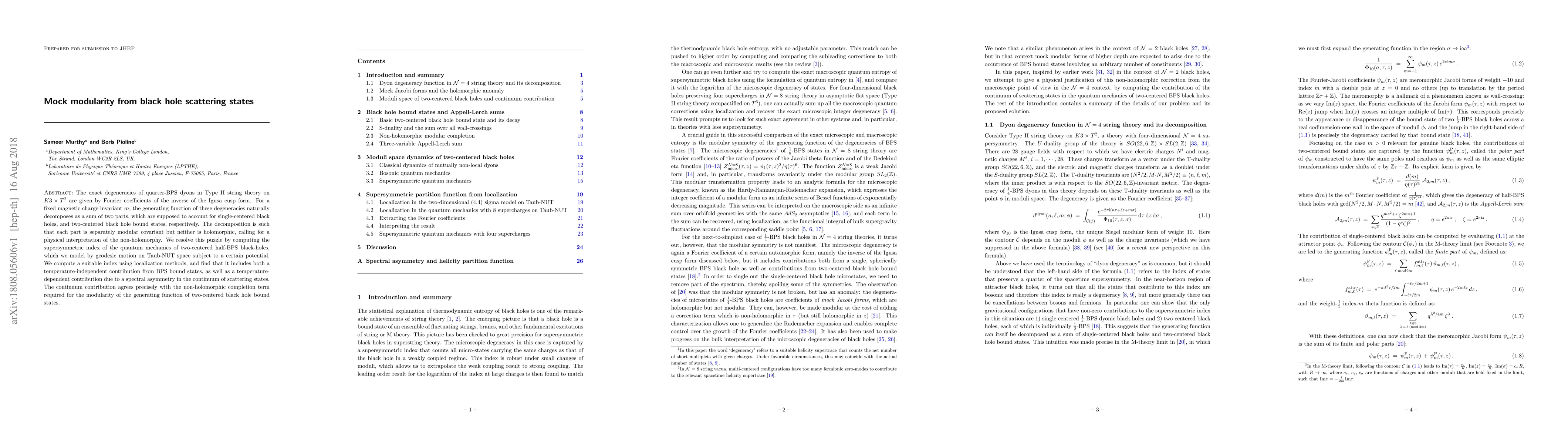 The exact degeneracies of quarter-BPS dyons in Type II string theory on $K3 \times T^2$ are given by Fourier coefficients of the inverse of the Igusa cusp form. For a fixed magnetic charge invariant $m$, the generating function of these degeneracies naturally decomposes as a sum of two parts, which are supposed to account for single-centered black holes, and two-centered black hole bound states, respectively. The decomposition is such that each part is separately modular covariant but neither is holomorphic, calling for a physical interpretation of the non-holomorphy. We resolve this puzzle by computing the supersymmetric index of the quantum mechanics of two-centered half-BPS black-holes, which we model by geodesic motion on Taub-NUT space subject to a certain potential. We compute a suitable index using localization methods, and find that it includes both a temperature-independent contribution from BPS bound states, as well as a temperature-dependent contribution due to a spectral asymmetry in the continuum of scattering states. The continuum contribution agrees precisely with the non-holomorphic completion term required for the modularity of the generating function of two-centered black hole bound states.