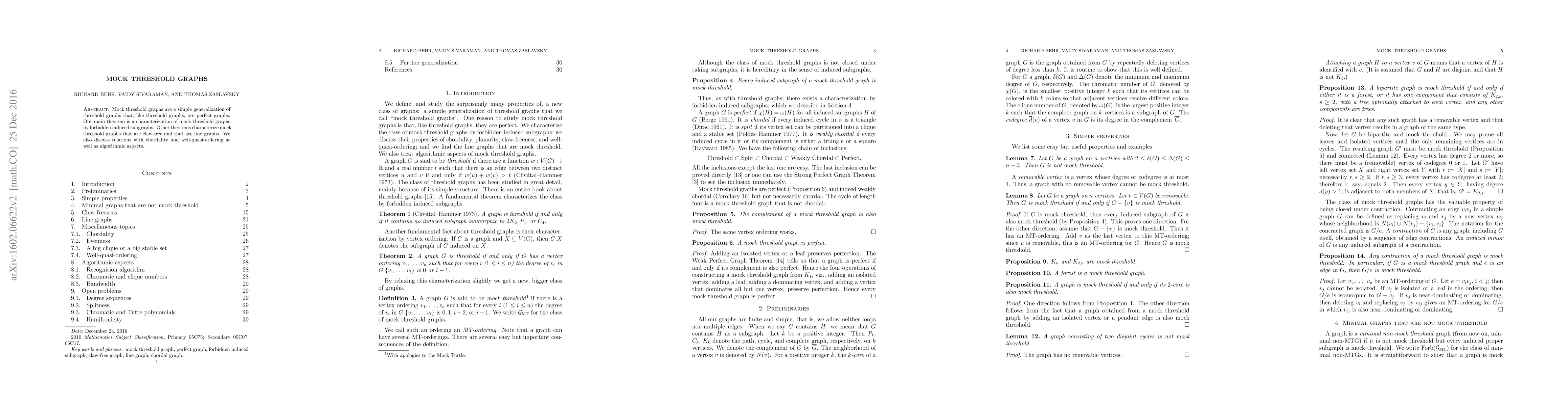 Mock threshold graphs extend the concept of threshold graphs and are characterized by forbidden induced subgraphs. The paper also explores their properties when claw-free and as line graphs, alongside discussions on chordality, well-quasi-ordering, and algorithmic implications.