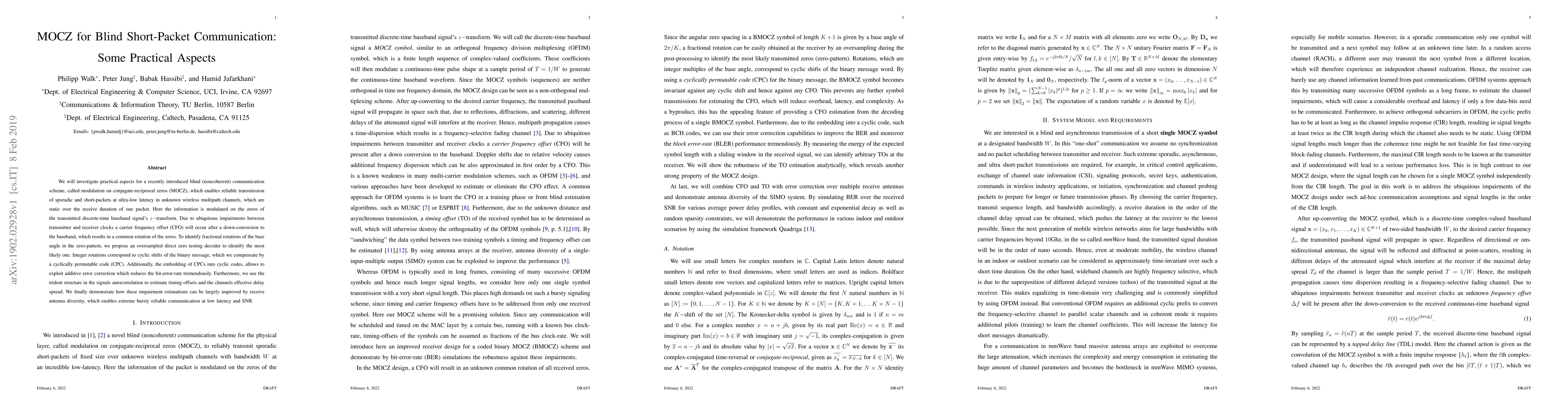 We will investigate practical aspects for a recently introduced blind (noncoherent) communication scheme, called modulation on conjugate-reciprocal zeros (MOCZ), which enables reliable transmission of sporadic and short-packets at ultra-low latency in unknown wireless multipath channels, which are static over the receive duration of one packet. Here the information is modulated on the zeros of the transmitted discrete-time baseband signal's $z-$transform. Due to ubiquitous impairments between transmitter and receiver clocks a carrier frequency offset (CFO) will occur after a down-conversion to the baseband, which results in a common rotation of the zeros. To identify fractional rotations of the base angle in the zero-pattern, we propose an oversampled direct zero testing decoder to identify the most likely one. Integer rotations correspond to cyclic shifts of the binary message, which we compensate by a cyclically permutable code (CPC). Additionally, the embedding of CPCs into cyclic codes, allows to exploit additive error correction which reduces the bit-error-rate tremendously. Furthermore, we use the trident structure in the signals autocorrelation to estimate timing offsets and the channels effective delay spread. We finally demonstrate how these impairment estimations can be largely improved by receive antenna diversity, which enables extreme bursty reliable communication at low latency and SNR.